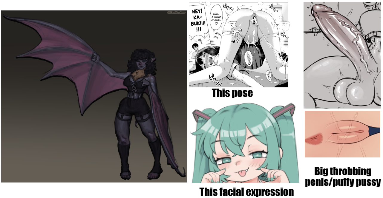 >>78464399 Requesting my bat girl being the brat that she is presenting her genitals teasing the viewer(her genitals can be either a penis or a pussy i really wouldn't mind having both but it's up to you)>>78464447>How does your OC feel about the Harvest Festival — excited, indifferent, or annoyed Good occasion to be a troublemaker >What's their favorite festival treat (candied apples, roasted corn, pumpkin pie, etc.)? She's a trashcan that can eat anthing but roasted corn is her favorite >Do they enjoy being around crowds or prefer to wander the quieter parts of the festival? Big crowds are a good occasion to be an attention whore >Are they the type to volunteer, compete, or spectate during festival games? Spectate because she sucks in doing most of those >What's their go-to outfit for the festival — cozy layers, work clothes, or something flashy? Something revealing only because her wings gets in the way >Festival Activities>Which event are they best at: pie-eating contest, pumpkin carving, or sack races? Most likely pie eating >Do they help set up or take down decorations, or avoid chores altogether? She's not helping at all lol >If there's a harvest dance, do they join in, refuse, or watch from the sidelines? Watch from the sidelines >What kind of booth would your OC run (e.g., fortune telling, homemade jams, crafts)? Money-stealing scam booth >Do they bring anything to contribute (baked goods, produce, handmade items)? She'd steal something from someone else and pretend she bought it for the occasion