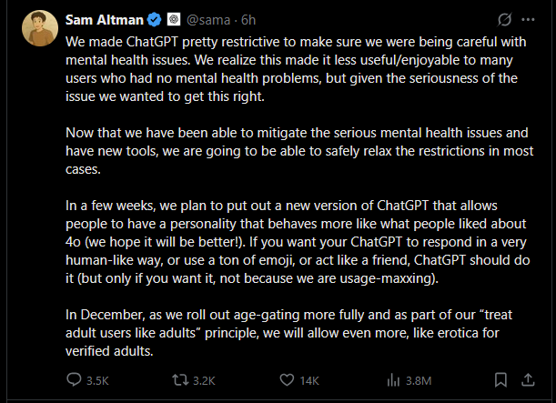 >>78566438I hope they do open up ChatGPT to erotica. I use it professionally and it's quite useful for quickly collating my work, but always baffled that people rely on it entirely for simple tasks instead of using their brains. Regardless, it's very hard to find someone not only into the same things as me, but who can actually write at a similar level to me with the same intensity so I'm actually excited.