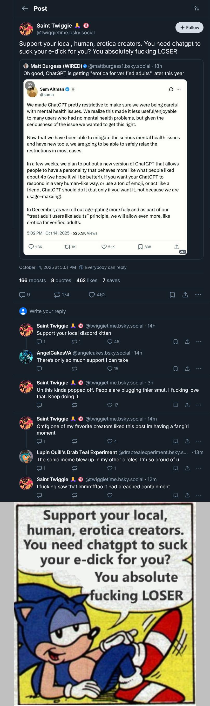 >>78568150The tweet. Seen that name a few times to recognize and be curious so I checked and it was a tranny.Also lmao to that anon thinking I'm here to convince anyone. Like dude, my anon, almost anyone remotely interested in AI has tried it by now and even the usual anti-AI artists just gave up with the nanobanana figure trend and now the Grok img2vid shit. Literally, the money grubbing corporations are the only entity in this entire world that still gives enough of a shit to try to convince you.