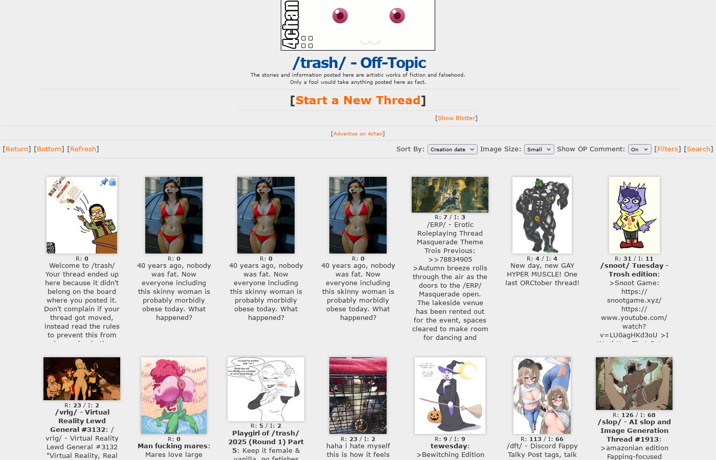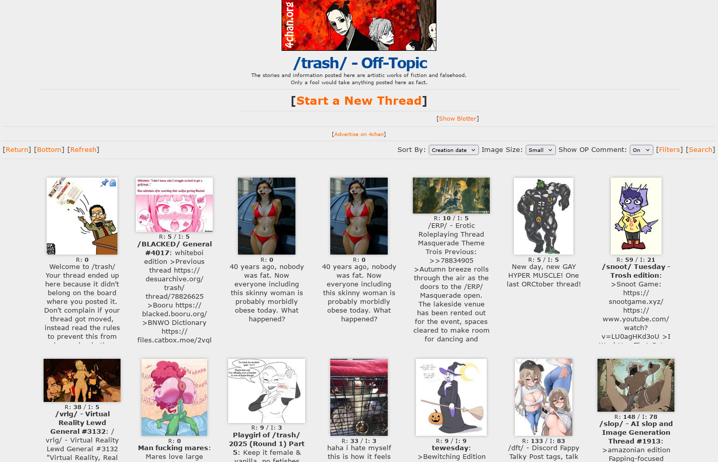 /trash/ was only good for 4-6 months before Shameless and other asexual /co/cksuckers brought in mental illness from BBWchan and co to flood everything about 1 girl standing partialism pinups. The rest is pathicus. You will never be viable and I'm glad AI is eradicating you all.