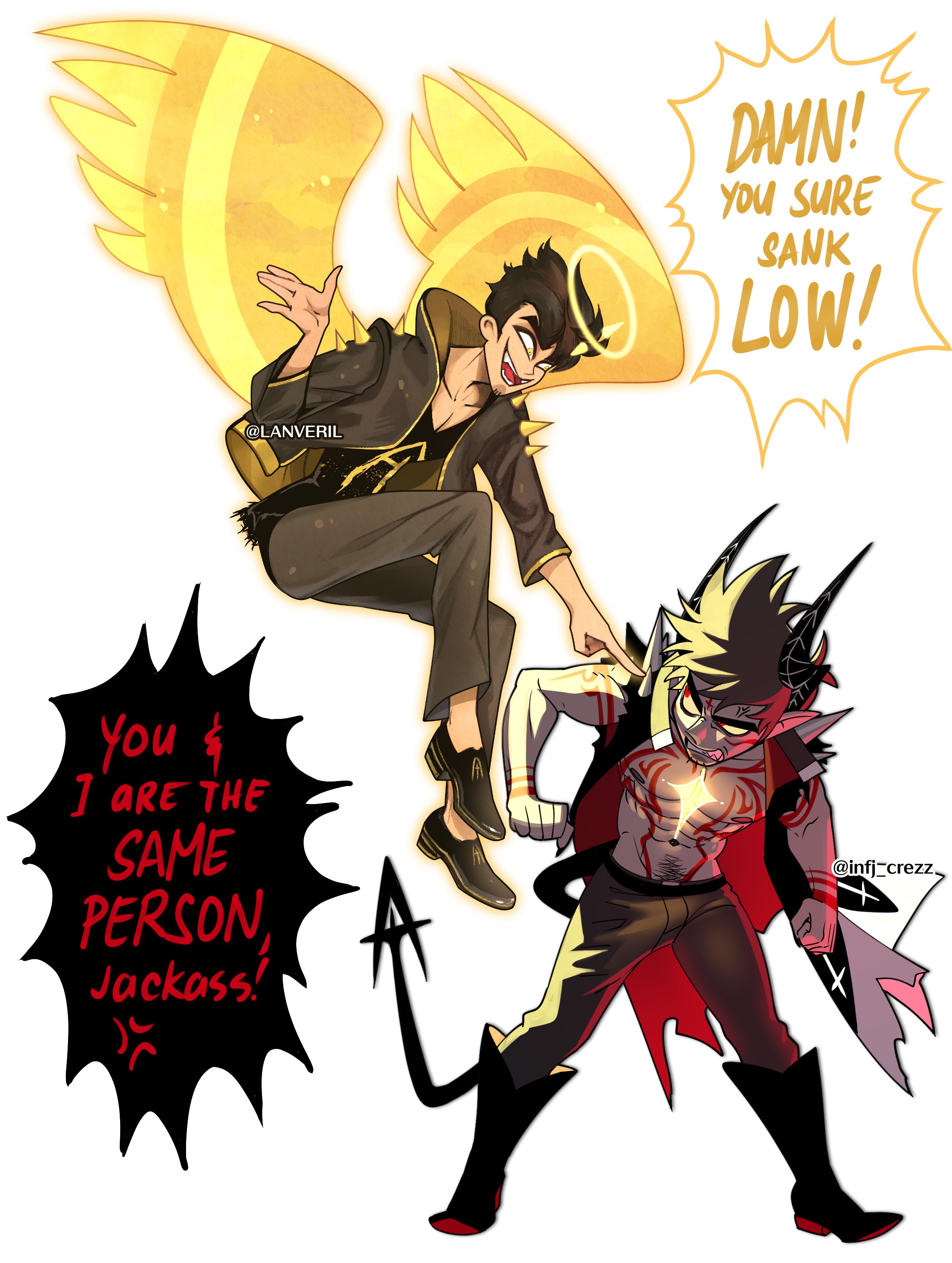 Happy Halloween :D>>78909241Wolfbel?>>78909712I think for Hazbin, Eve's gonna be blonde to explain why Abel came out blonde. Lucifer's genes are very noticeable for Charlie and Abel has alot of his Adam's traits such as his wings. I think Heaven would know if there was (fallen) half-seraphim blood from Abel>>78910918In the perspective of Hell's residents, it makes sense. All I wish was that things were wrote with more structure because with the way that Heaven was being ran from above, it makes me wonder how they got through centuries...>>78911747Angel man bad, that's why>>78912185I'm not surprised of a Viv character being some flavor of lgbt but Saint Peter of all choices was a little weird, I can't lie>>78913039Happy Halloween SCsis :>