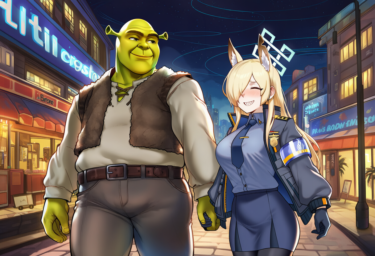 >>79219188Grok Shrek having a romantic date with a Blue Archive girl