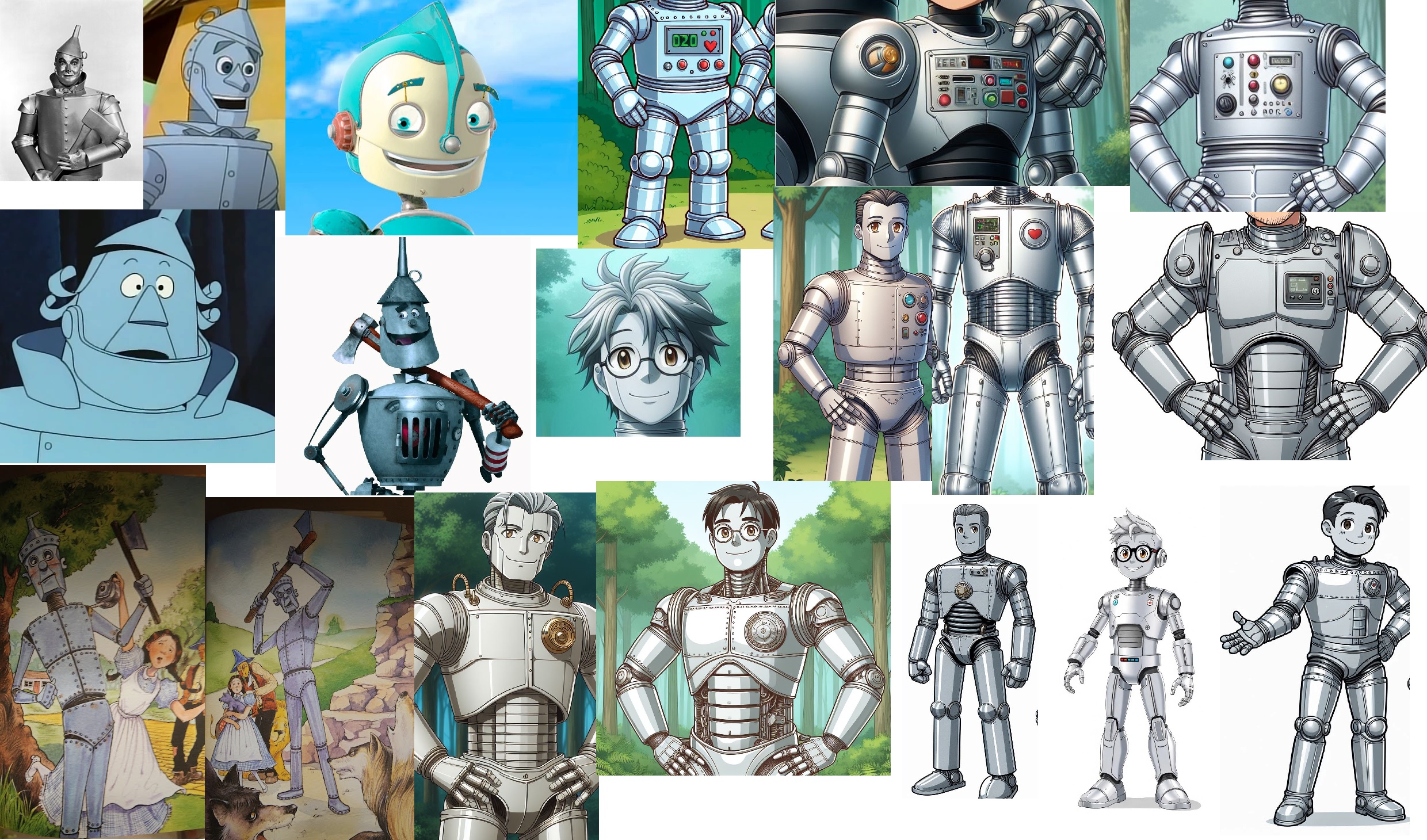 >>79226045Requesting an anime OC of a Tin Man style robot, with a humanlike head with metallic silver skin, short silver hair, brown eyes, glasses, a hinged jaw piece, round robot ears, a chest piece/ torso that's a cross between that of the Tin Man from the 1939 movie and one of those Japanese Metal Heros characters, with his right side having a control panel and robotic buttons from him to press, and his left side having a small hatch door where his heart should be, a silver metallic paintjob, silver humanlike hand, and silver robot boots, and a groin piece, standing in a full body draw, smiling. Please keep it SFW.