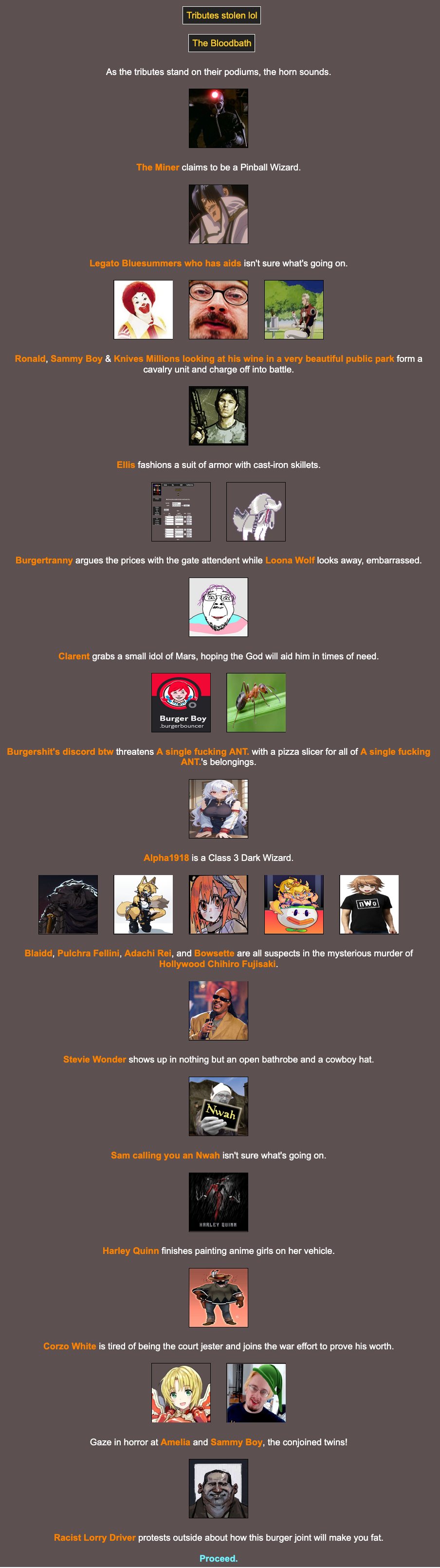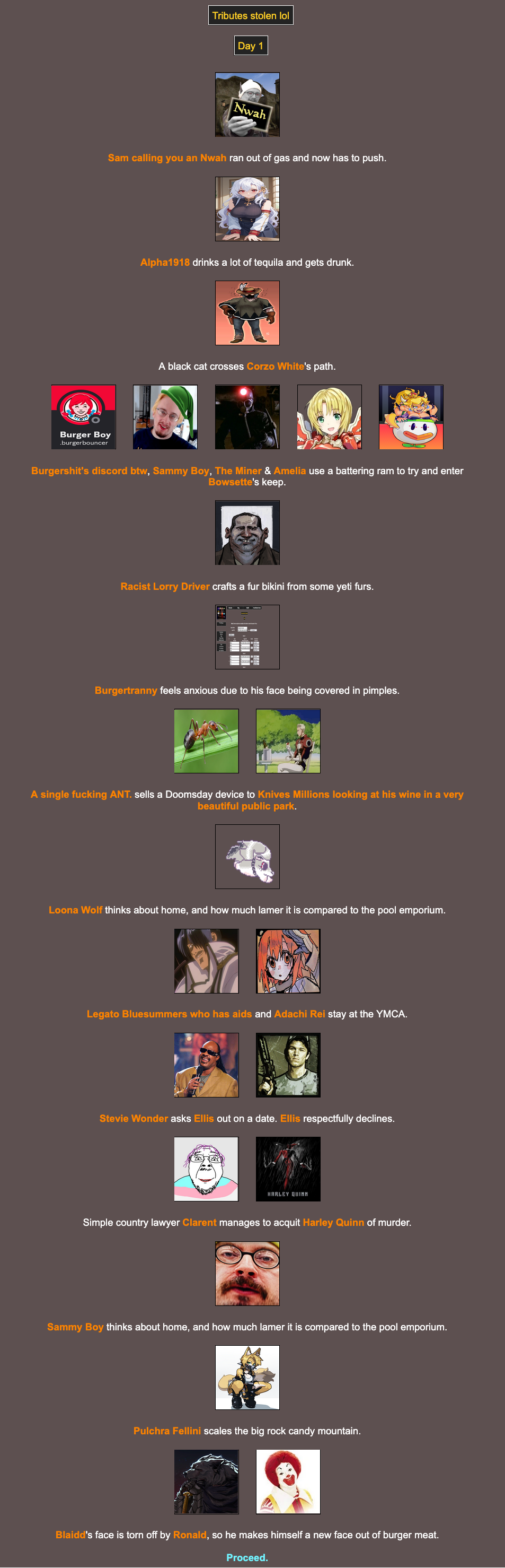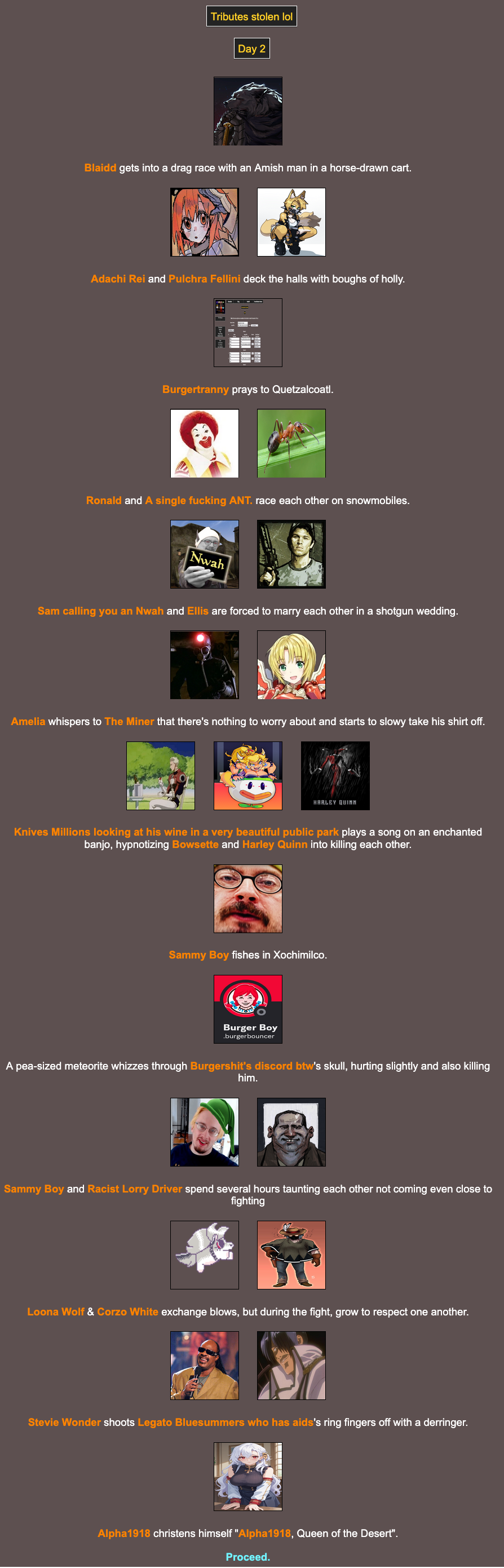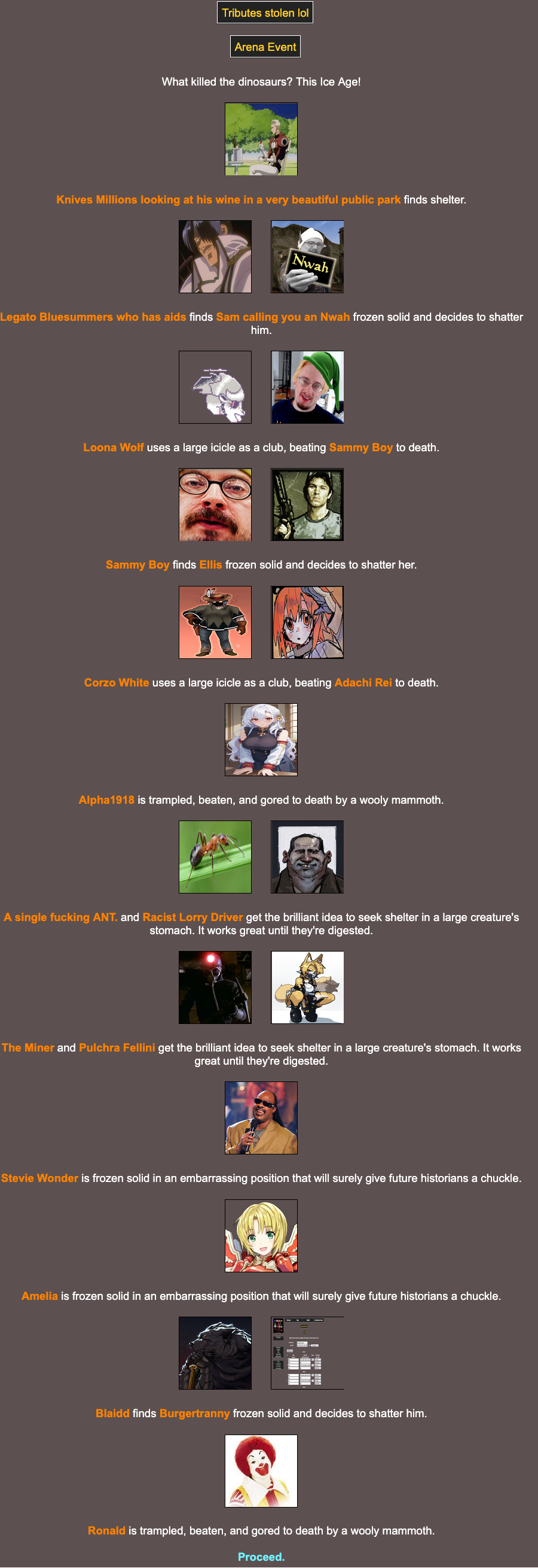 Location: Penguin Expedition>We periodically host a web-based battle royale that can include anything and anyone. Shenanigans ensue, and some people attempt to write it into semi-coherent narratives, playing the part of the characters within! Check here for additional details:pastebin.com/XMLz3hnTbrantsteele.net/hungergames