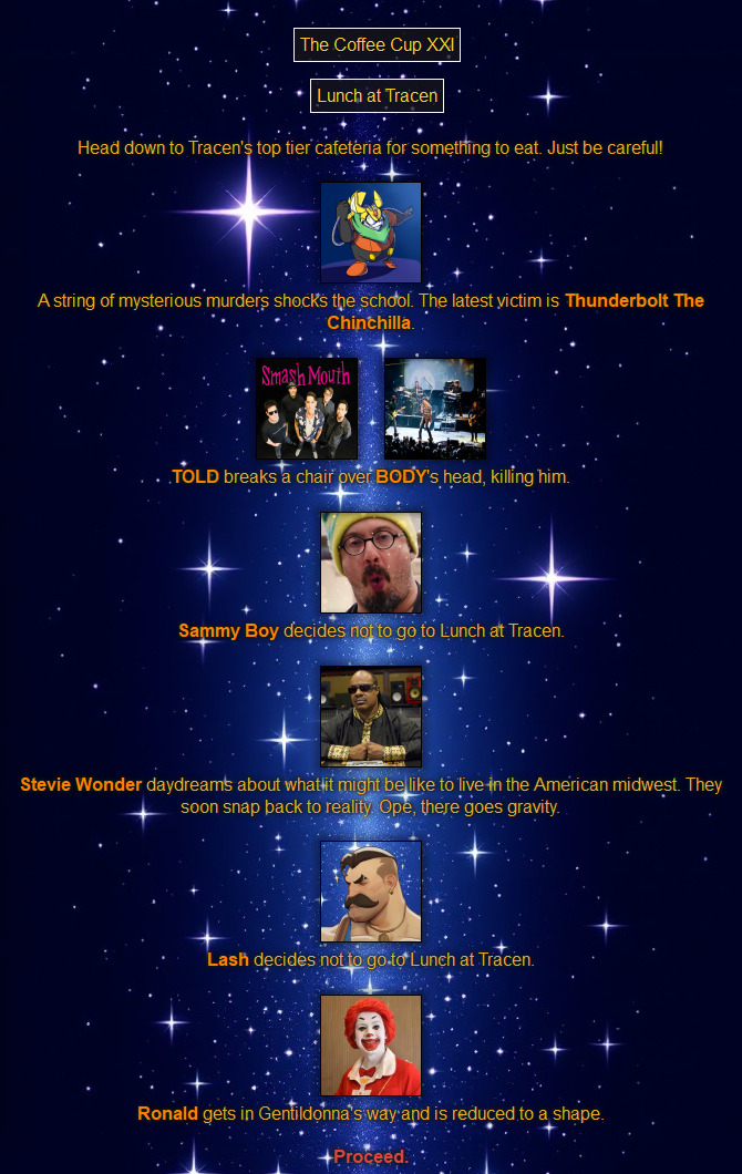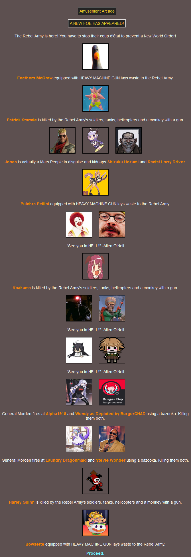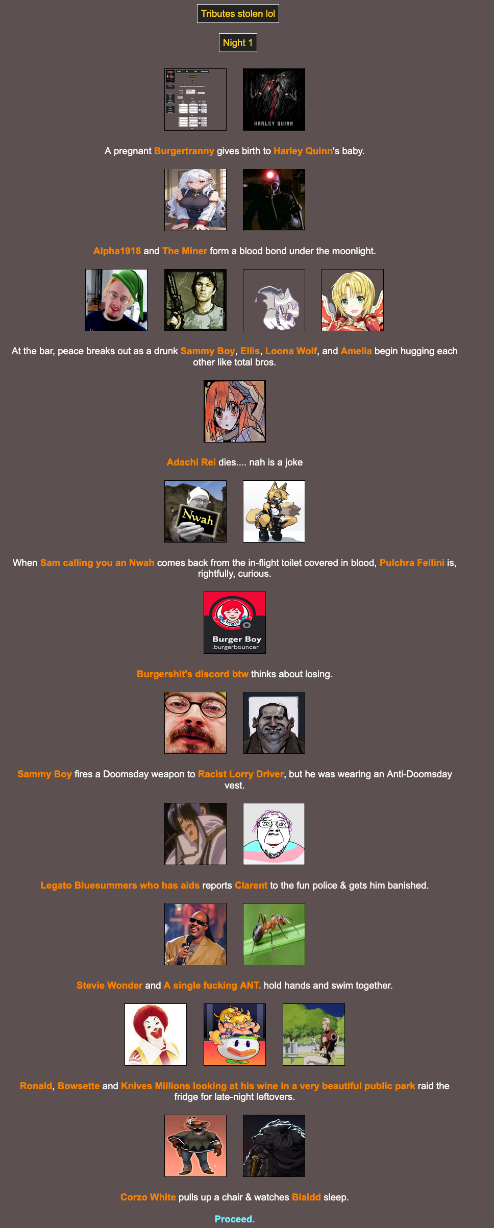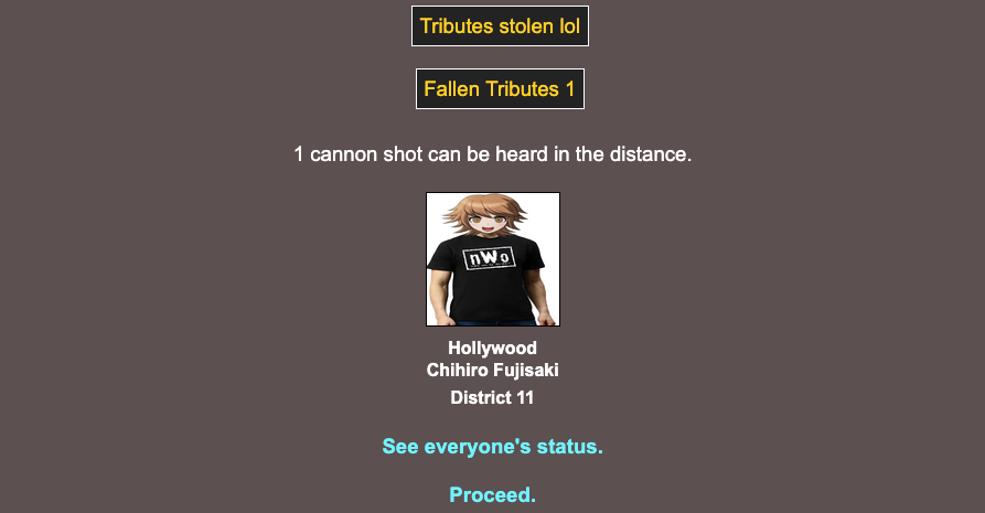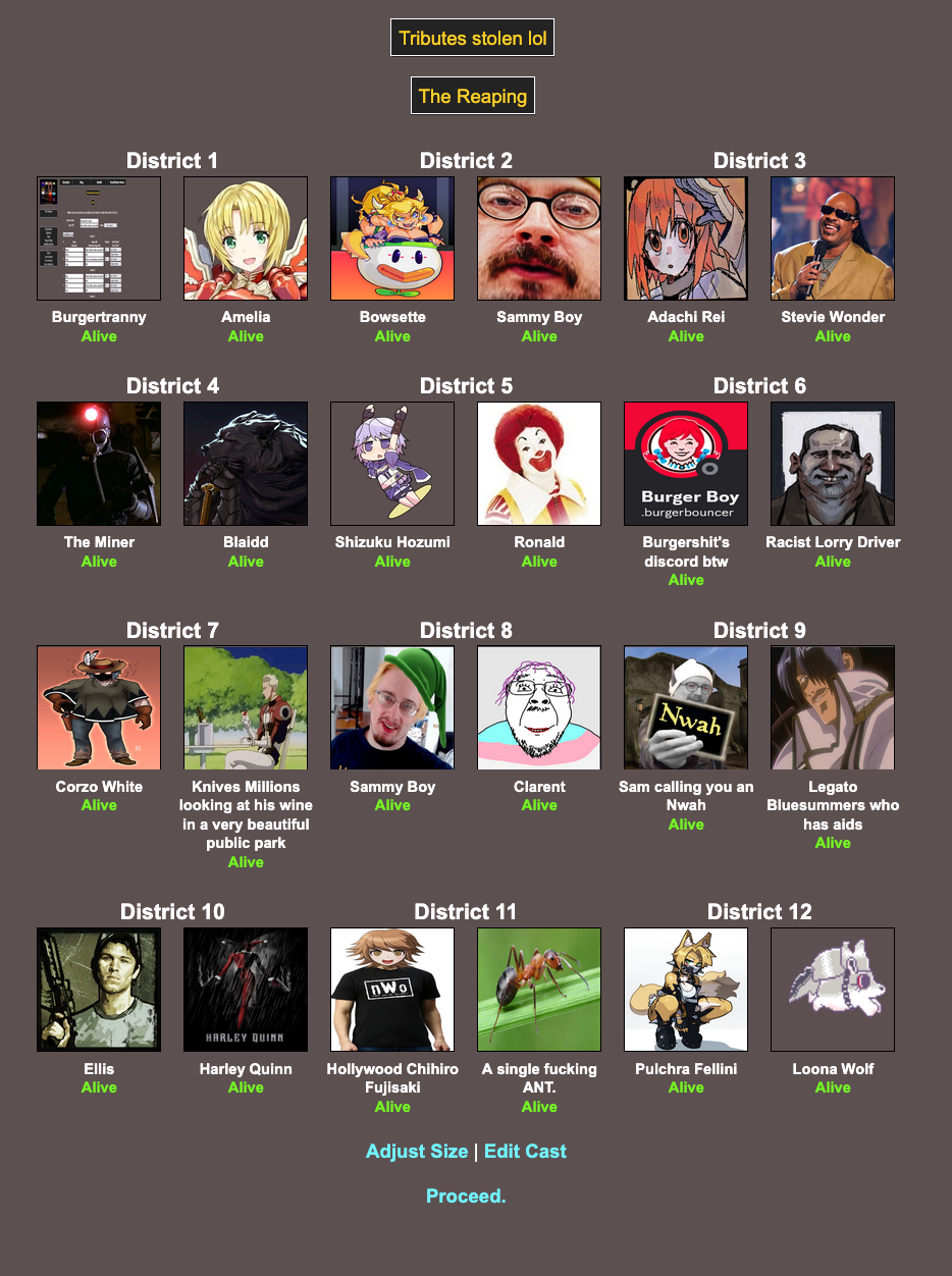 Location: Penguin Expedition>We periodically host a web-based battle royale that can include anything and anyone. Shenanigans ensue, and some people attempt to write it into semi-coherent narratives, playing the part of the characters within! Check here for additional details:pastebin.com/XMLz3hnTbrantsteele.net/hungergames
