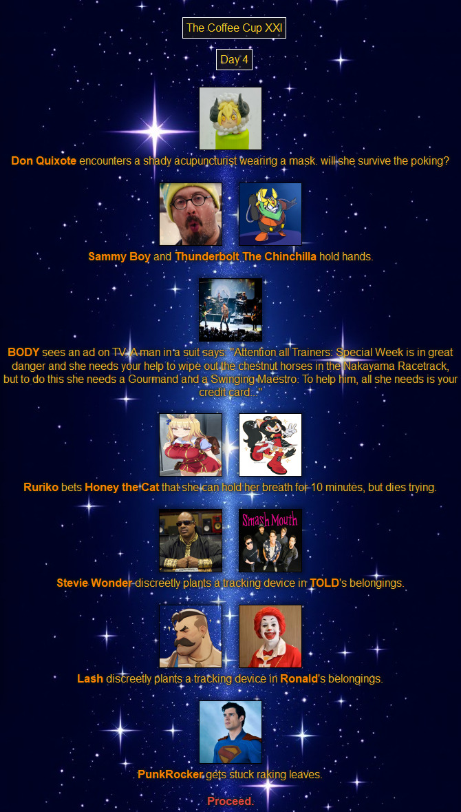 >>79288994Quixote is in danger!Meanwhile one of my double crowns go down. Glub glub.>>79289011Put on the mask for Mexicano Authentico, mi amigo.>>79289016And here too. You only watched someone die this time.>>79289023I'll just scoot over into the other thread if I need to. Why not? It's there.>>79289017Trust me, you don't want to tangle with the Cygames lawyers.