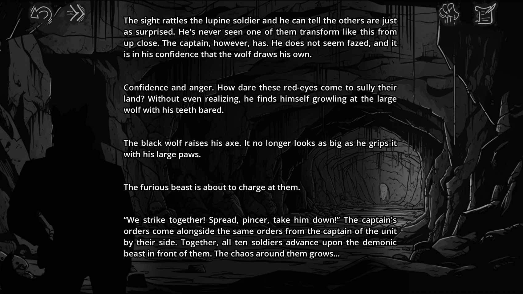 The Transformed Black Wolf from the Opening (Presumably Kormack) is keeping pace against 10 Soldiers (and if it is Kormack, manages to escape relatively unharmed at worst).