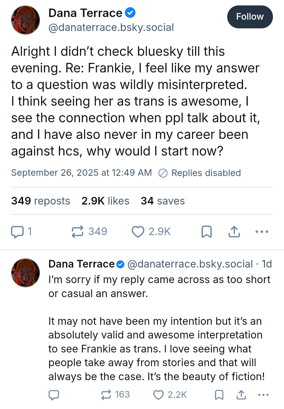 >>79379051I dig your idea involving Hexside, missed potential there. Could've worked Luz leaning into Eda's perspective on school naturally by experiencing it first hand, and maybe having her earn the respect of others by solving situations from outside the box (showing that Luz being an outsider is more of a strength than weakness).>>79379154To be fair, Disney's S&P is notorious for being the most strict out of all animation companies so I can see someone like Dana being wary to compromise with the mouse. Still, probably didn't help that Dana was so vocal against Disney while working with them.