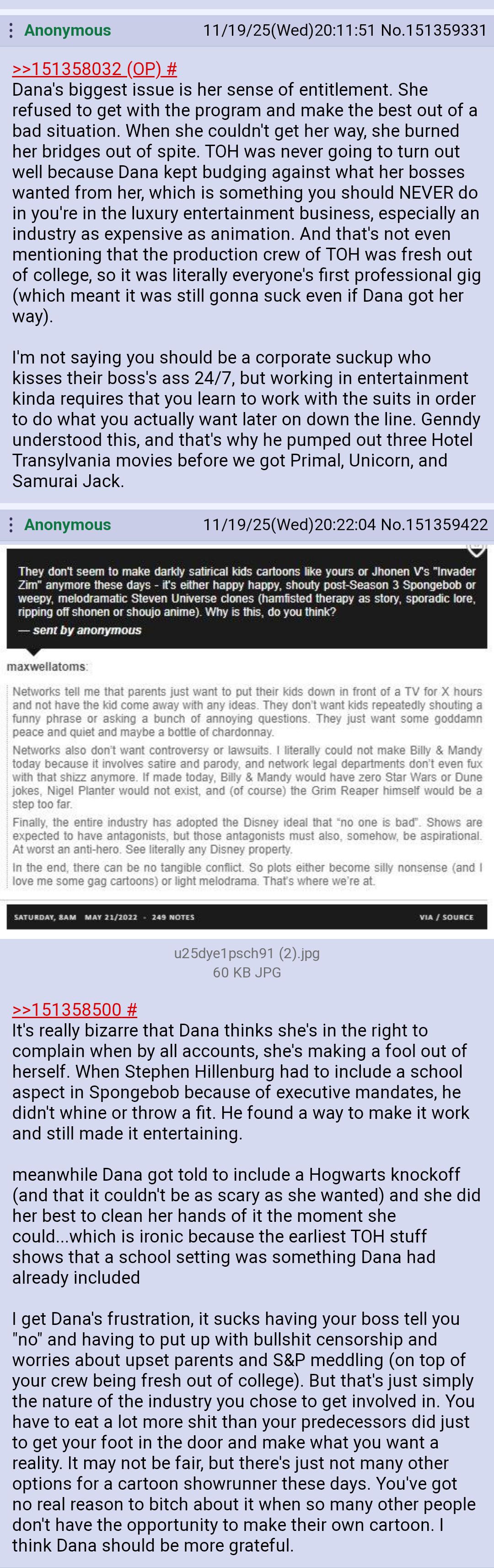 I do get the impression this debate is exclusively about Disney's ToH and Dana's ToH, that's really the only reason I see this existing honestly. I don't really understand it when most show's always do that kind of thing where the first season either writes around what the company wants or they don't have much restriction as long as it wasn't something that would slip out of the intended audience, but I feel like it's mostly about people that wanted Disney's ToH aka Season 1 but didn't get what they wanted so they grew a grudge towards Dana for it.This feels like the opposite effect with Spongebob and the boating school element where Nick wanted Spongebob a retarded special eds kid for the baby audience but Stephen didn't wan't that so he compromised by making it a boating school for a teenaged coded spongebob instead of the original vision of him being a young man.