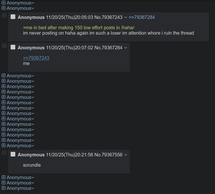 >me in bed after making 150 low effort posts in /haha/ im never posting on haha again im such a loser im attention whore i ruin the thread