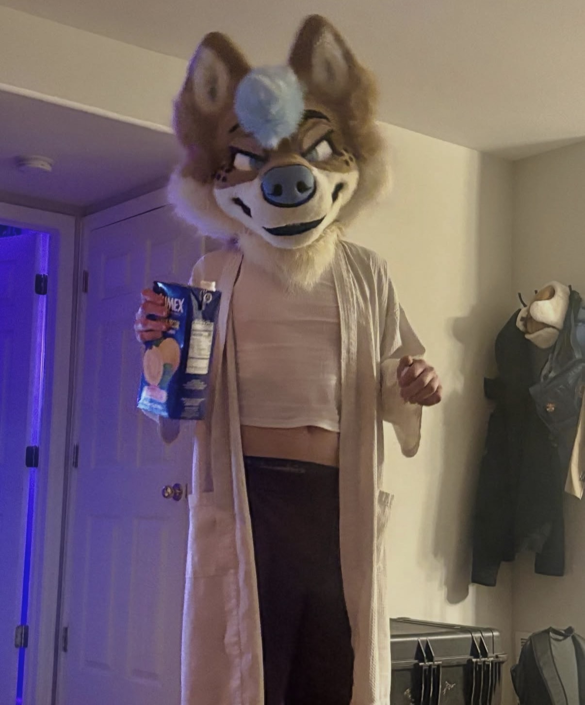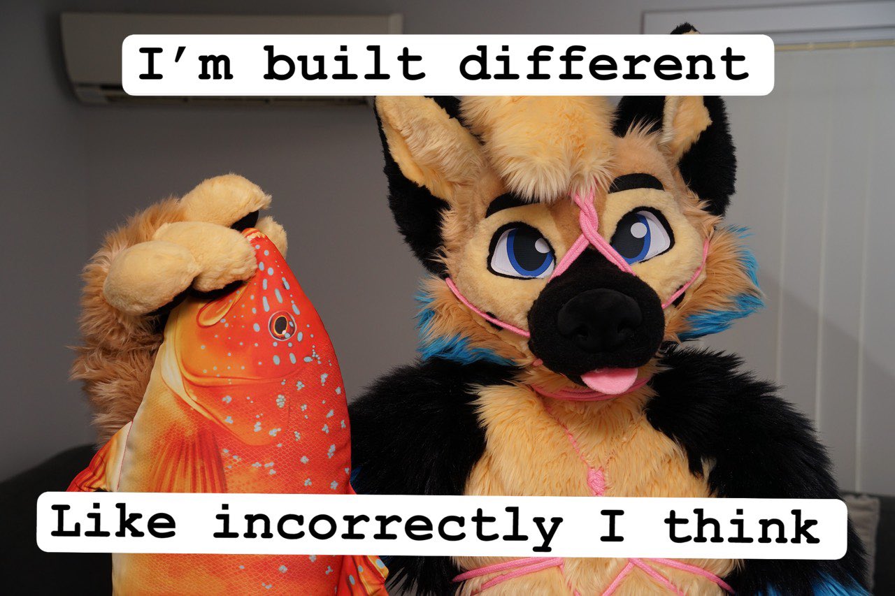 >>79365885he's wearing a humansuit partial but without the headhe's also got digitigrade paws stuffed into human shoes, that's why his legs are bent weird