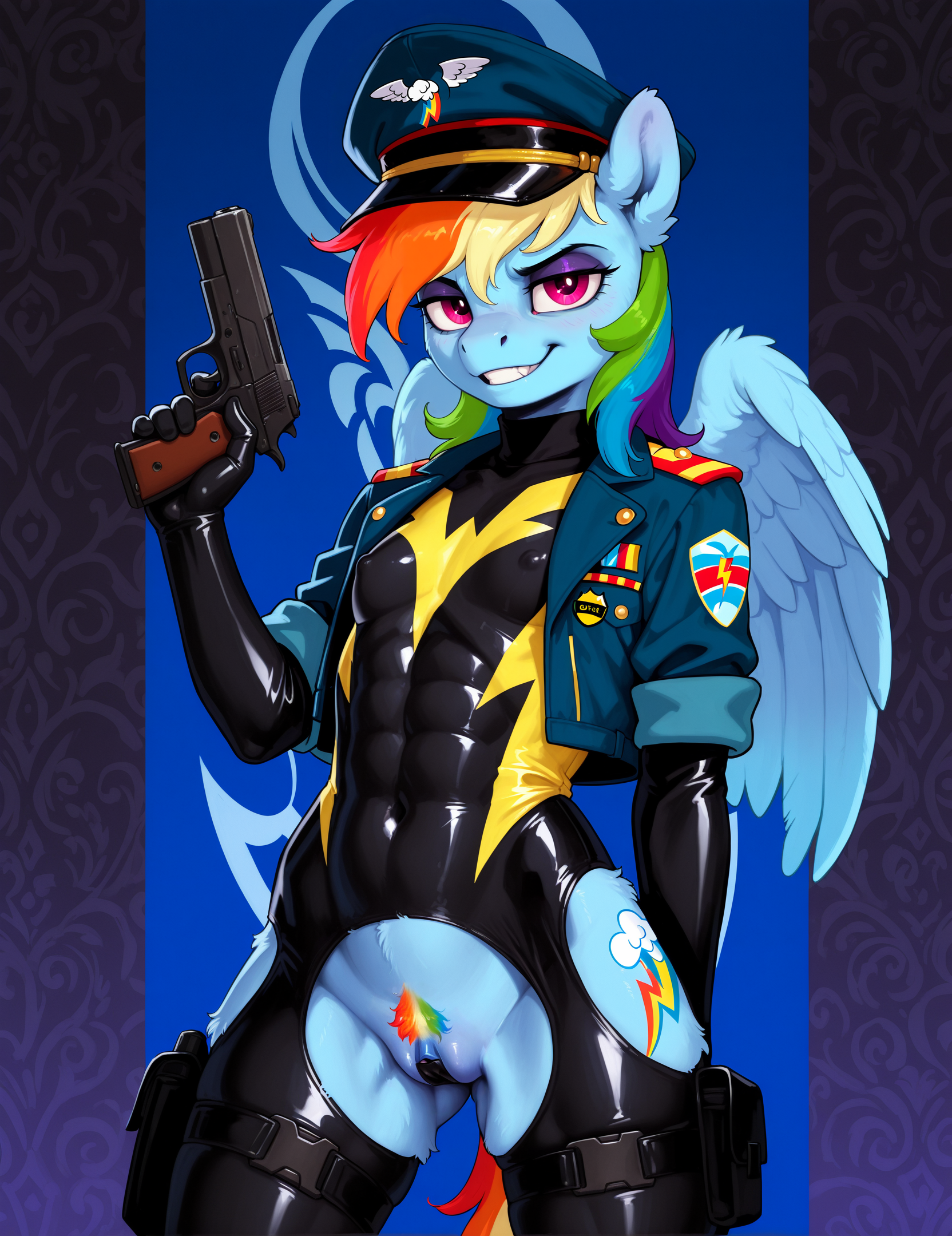 >>79632750>Rainbow Dash's lookI love the goofy militarism in these uniforms. Did the AI put her mark on the hat my itself or did you paint that there?