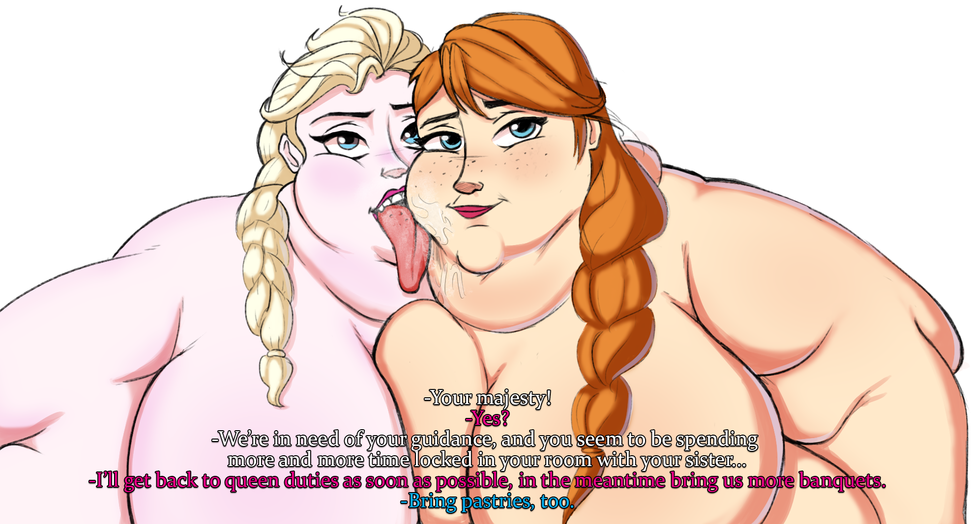 >>79739470Considering how fat they are, she’ll need an enormous strap-on for that.But they do often passionately kiss.