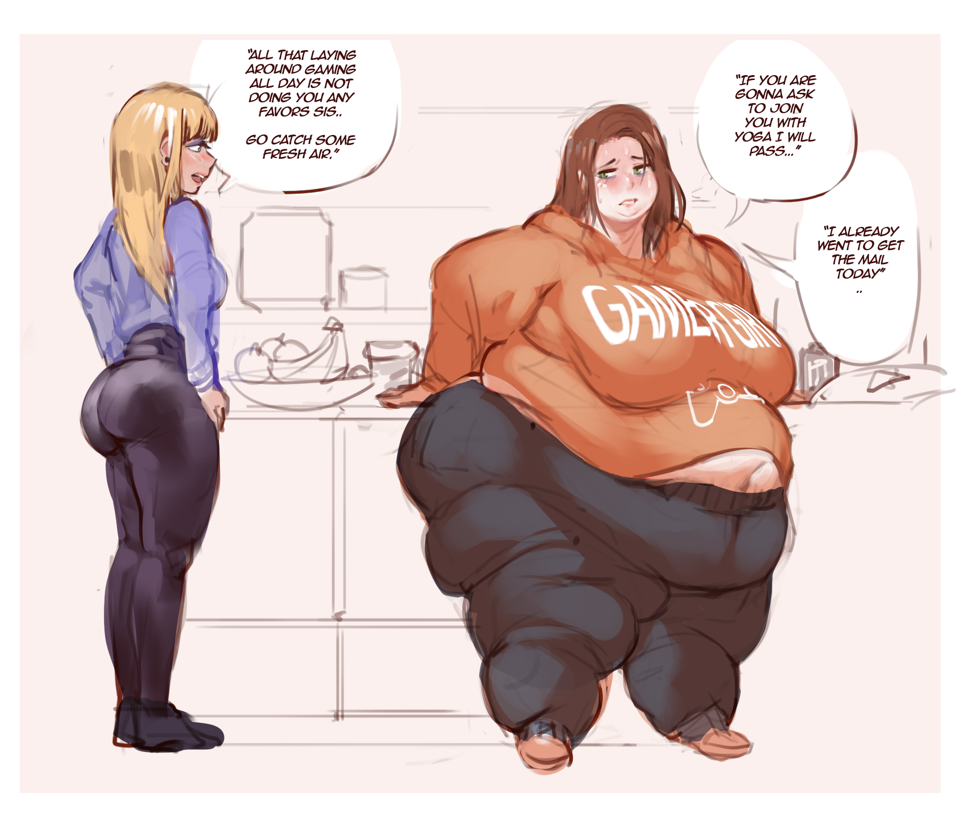 >>79861569>>79863278This gives me an idea.2 sisters, both being overfed/fattened up by the mom. >They tease and insult each other constantly over being "the fat one">Both are nearly the same weight within a couple of pounds they trade places constantly as "the fat one" constantly measuring and weighing each other to see who's a fraction of a pount heavier so the lighter one can delude herself can delude herself about being the "thin sister">They constantly pul whacky highjinx to sabotage the other's weight from sneaking calories into the other's food, messing with the other's private scale, setting up food temptations amd the ultimate trump card, engineering circumstances to trap the other sister with their mom who will practically force feed them delicious food until they nearly pop ensuring they're the "fat sister" for the next week or 2.