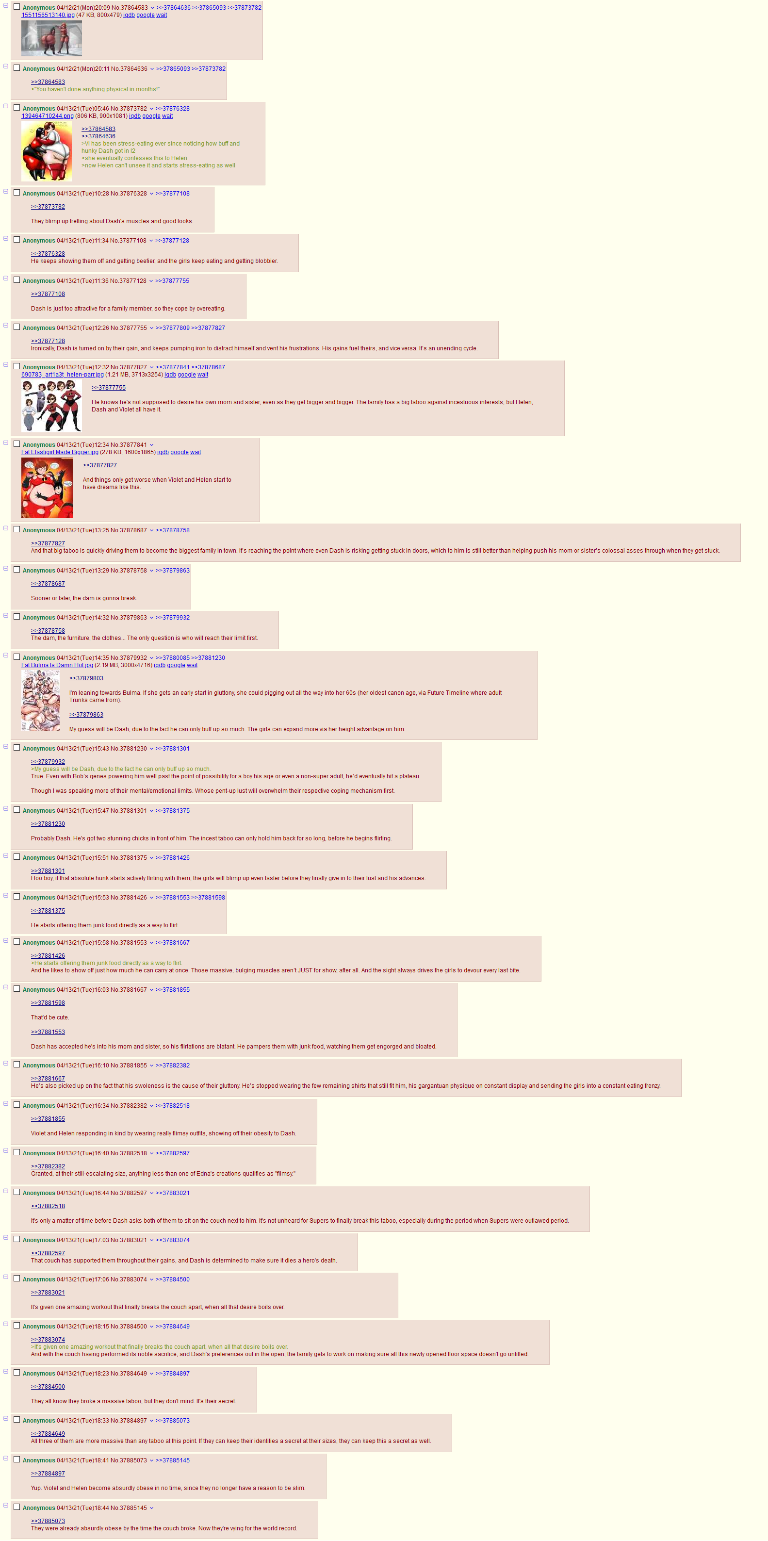 >>79752264I like this idea except for the continuous lard siphoning part. Personally I find it hotter if they're allowed to swell up to a certain size before they're collected for harvesting where they disappear for a day to get processed and return to their normal fattening life reset back to being just chubby. Each cycle they get a bit bigger before harvesting as their skin and bodies adapt to stretching to bigger and bigger sizes thus producing more and more 'fuel' each time. Women get the biggest because of genetically more elastic skin on account of pregnancy related evolutionary adaptation. Eventually though even the biggest girls reach their limits and fatsplode. Biomedical technology of the time means it's not fatal but very uncomfortable and puts the fatsploded girl out of commission for several weeks. Later, advances in the same regeneration tech shorten the recovery time down from weeks to hours and simultaneously it's discovered that bursting and going through the regeneration process boosts both fat cell production as well as increases maximum size before bursting. These factors mean being fattened to bursting is no longer something to be avoided but in fact the optimal cycle for maximizing fat fuel production.(I'm kinda a burstfag I can't help myself, especially when presented with a utopia turned dystopia scenario)This is kinda inspired by this one story I read ages ago on DA of a near future sci-fi setting where greedy gluttonous teenagers are in a mall eating themselves to immense sizes in a hyper consumerist semi-dystopia where obesity is championed and in vogue. However one friend returned to the group "skinny" and one of the girls just casually remarks something about "oh she finally popped huh? Shame she has to start all over again" and is depicted as losing some social status.Can't remember the name and frankly with DA's gay ass moderation these days it may not even exist any more.