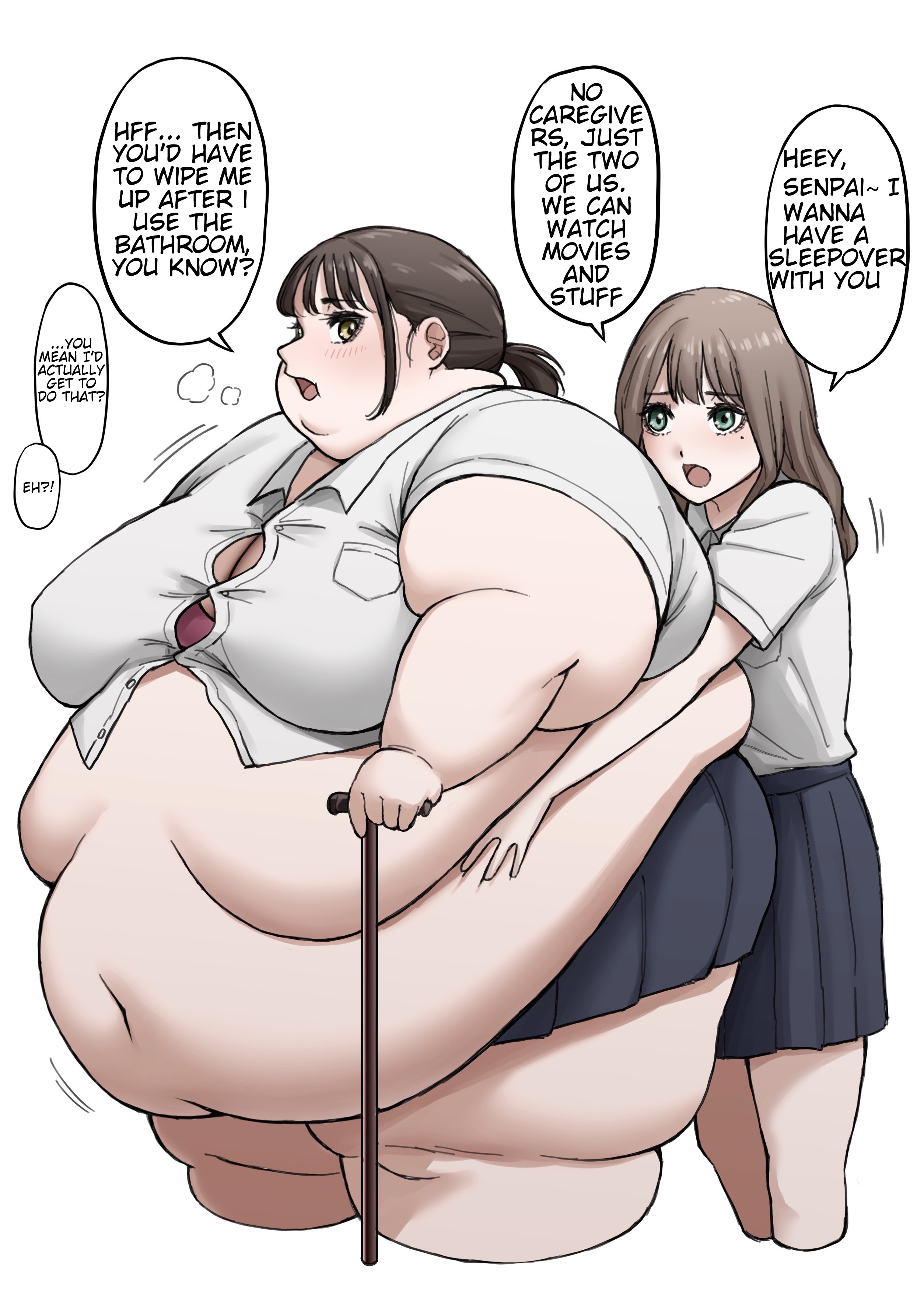 >>79871549Oh YES! Maybe a fat American girl goes to a foreign school as an exchange student. The skinny local girls invite her to a sleepover fascinated by her size.They're only more in awe once she's there in person, her tight ill fitting pajamas revealing her obese figure in more detail than her regular clothes. The fat girl is super nervous and uncomfortable realizing it's her weight making her the center of attention, but instead of cruel mocking it's genuine excited interest and she slowly begins to warm up to their attention. This sort of flattery soothes her ego enough that she actually says 'yes' when one of the girls musters up the courage to ask if they can feel her fat, soon she's being felt up on all sides as the local girls fondle her in awe.They also make sure to have plenty of food for her during the sleepovers and eventually she gets comfortable enough to really pig out and stuff herself, this excites her hosts more as they marvel as the sheer volume of food the fatty can pack away. The sleepovers quickly devolve into informal stuffing sessions as the local girls egg her on and encourage her to eat as much as she can so see her belly swell with food.The fat girl finds that stuffing herself in front of an encouraging audience while being fondled and groped is starting to become deeply arousing for her and she's struggling not to show it.The local girls meanwhile are starting to discover things about themselves and are becoming more encouraging to the fat girl until they start volunteering to 'help' the fatty finish bigger and bigger meals by hand feeding her and rubbing her belly when she's too stuffed to continue on her own.These developments meanwhile are only serving to torturously edge to fat girl until one night she can't take it anymore and as one girl is practically forcing food into her already packed stomach another is circling her fingers on the tight sensitive skin around her navel the fat girl orgasms loudly and obviously.