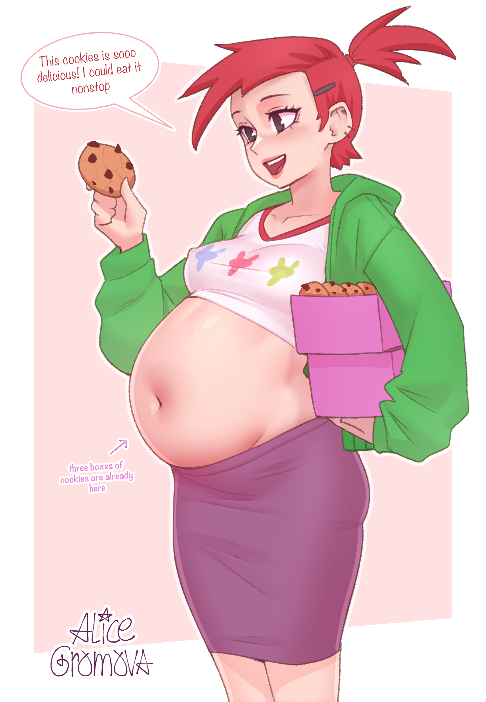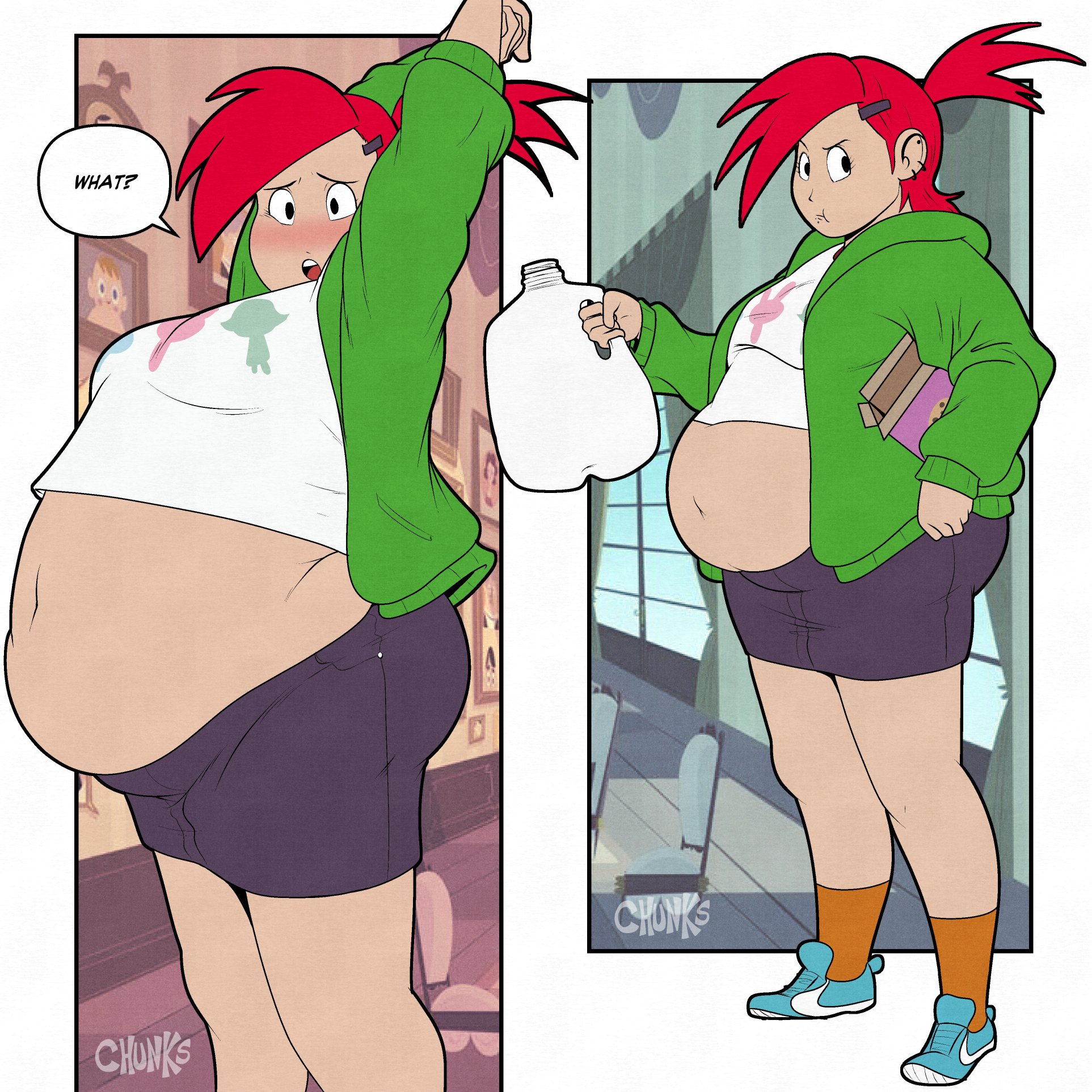 As far as Frankie and her cookie rampage goes. I wonder how she felt after her cookie high finally came to an end. Like would she be disgusted with herself? Super nauseous? Groggy? Etc, etc. Hell are there any drawing that touch upon that? I’ve only ever seen drawings of her stuffing herself silly or as a fatass happily glutting herself. Never anything showing the immediate aftermath of the canon binge.