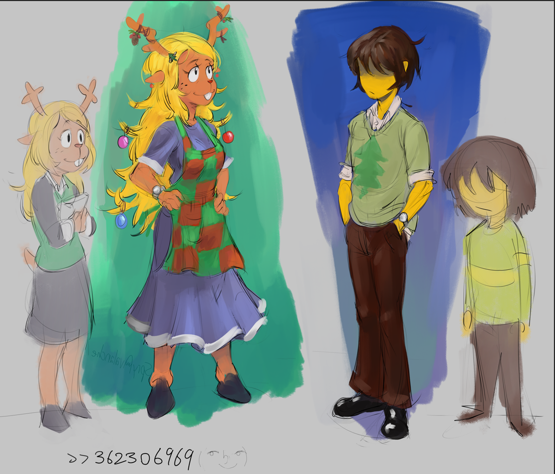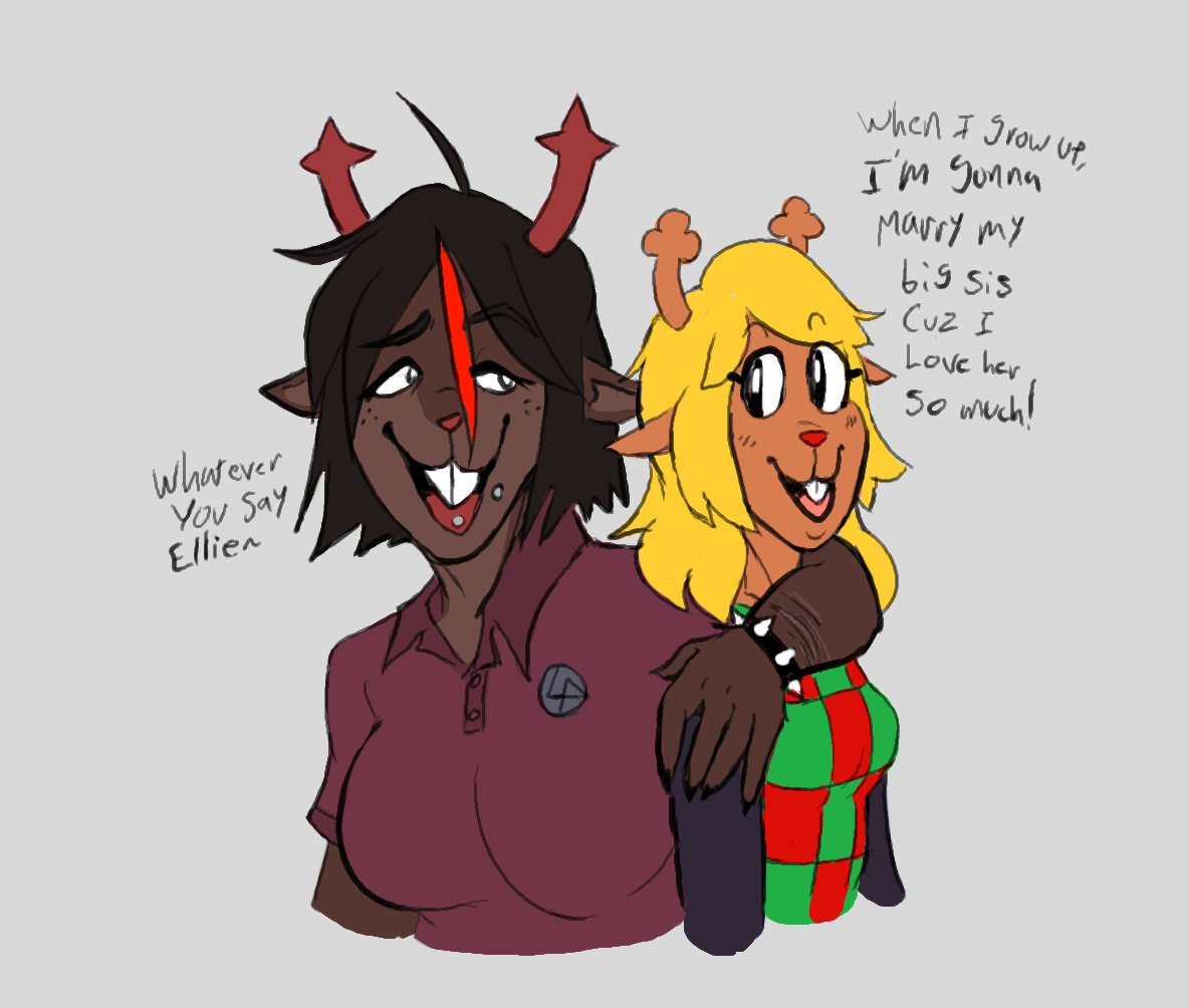 >>79881390The Holiday sisters (16/14/6)a little note about their dynamic, Jan envies Dess because she gets away with more stuff as the youngest, Dess envies Noelle because Noelle is the baby of the family now and gets the most attention. Also Dess uses her height to bully Jan sometimes.