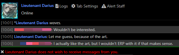 It's fun but you have to be quite strict about telling people no. If you play rapebait lots of people will assume you're OOC rapebait also and try to rape (browbeat) you into roleplaying with them. Also beware the cold open DMs from people blowing their loads on your /c/...