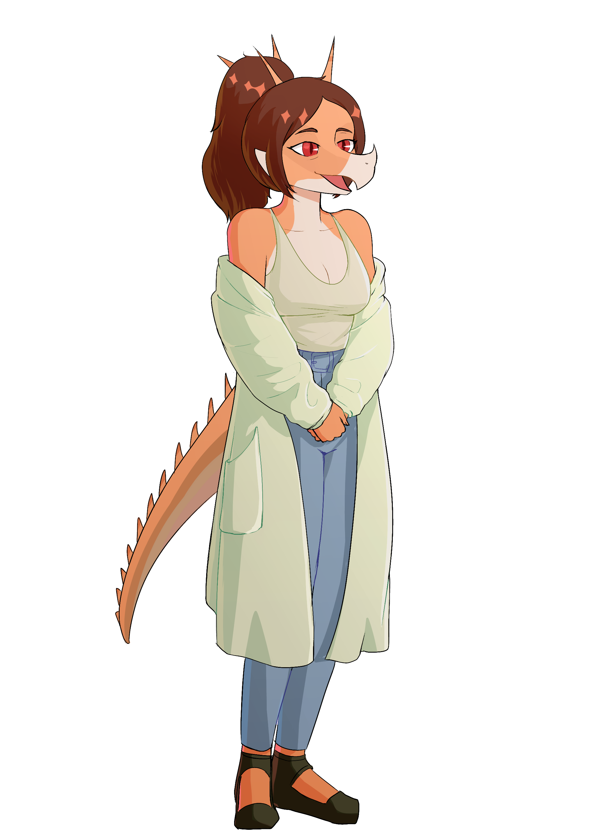 >>79894119We don't have another reference or particularly deep details on human/saurian hybrids outside of Amber and Trent (or North if you want to be unfunny and obnoxious). There's a couple of attempts at visible hybrids like Joshua and that one Wani fankid but they're fringe and it can be surmised just by their reception why Cavemanon didn't go that angle. Most common fanworks I've seen does have them have some differences from pureblood saurians like stubbier snoots and the idea of more muted saurian features but that's about as far as you can work out of the designs especially when we just see them as infants in canon material.