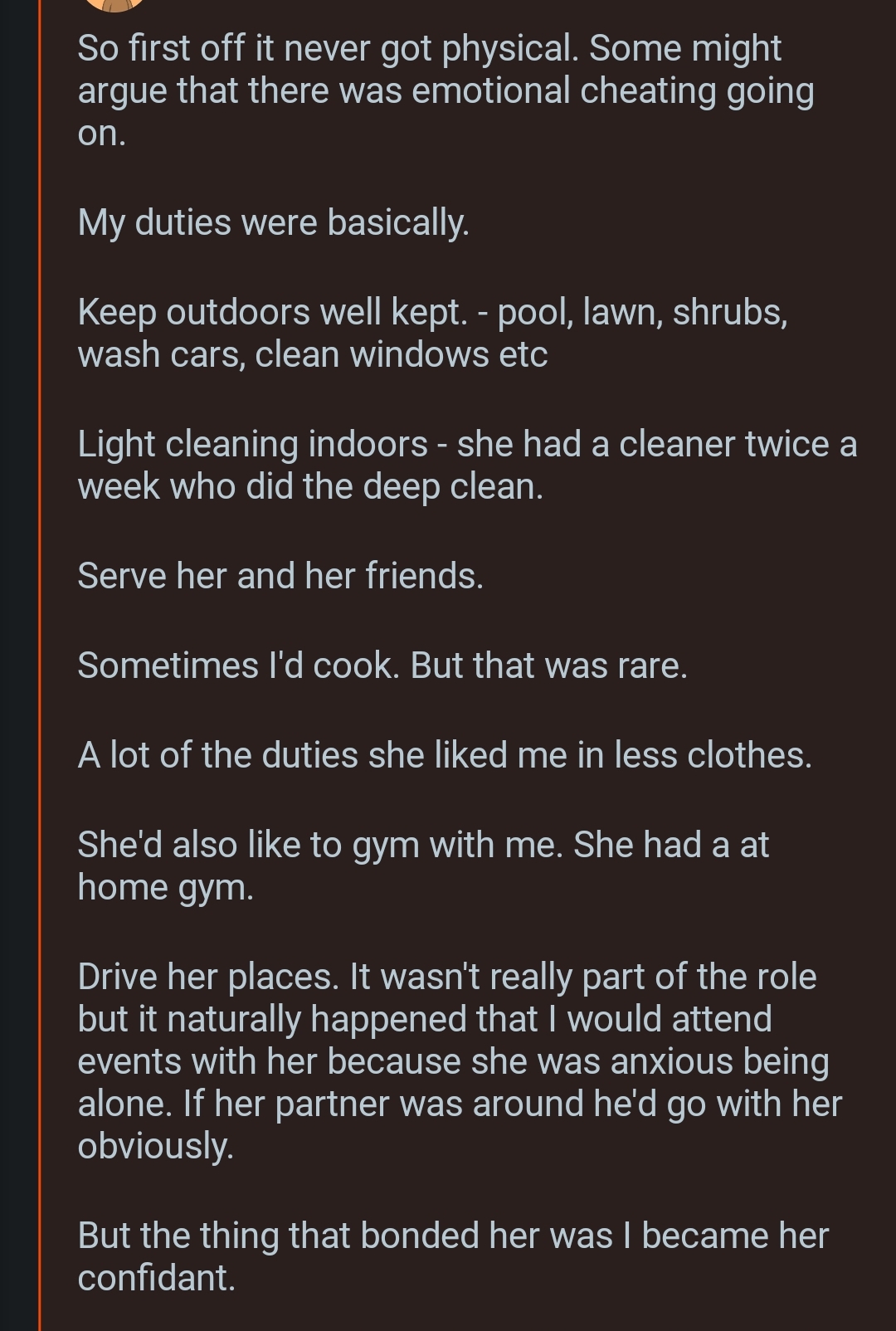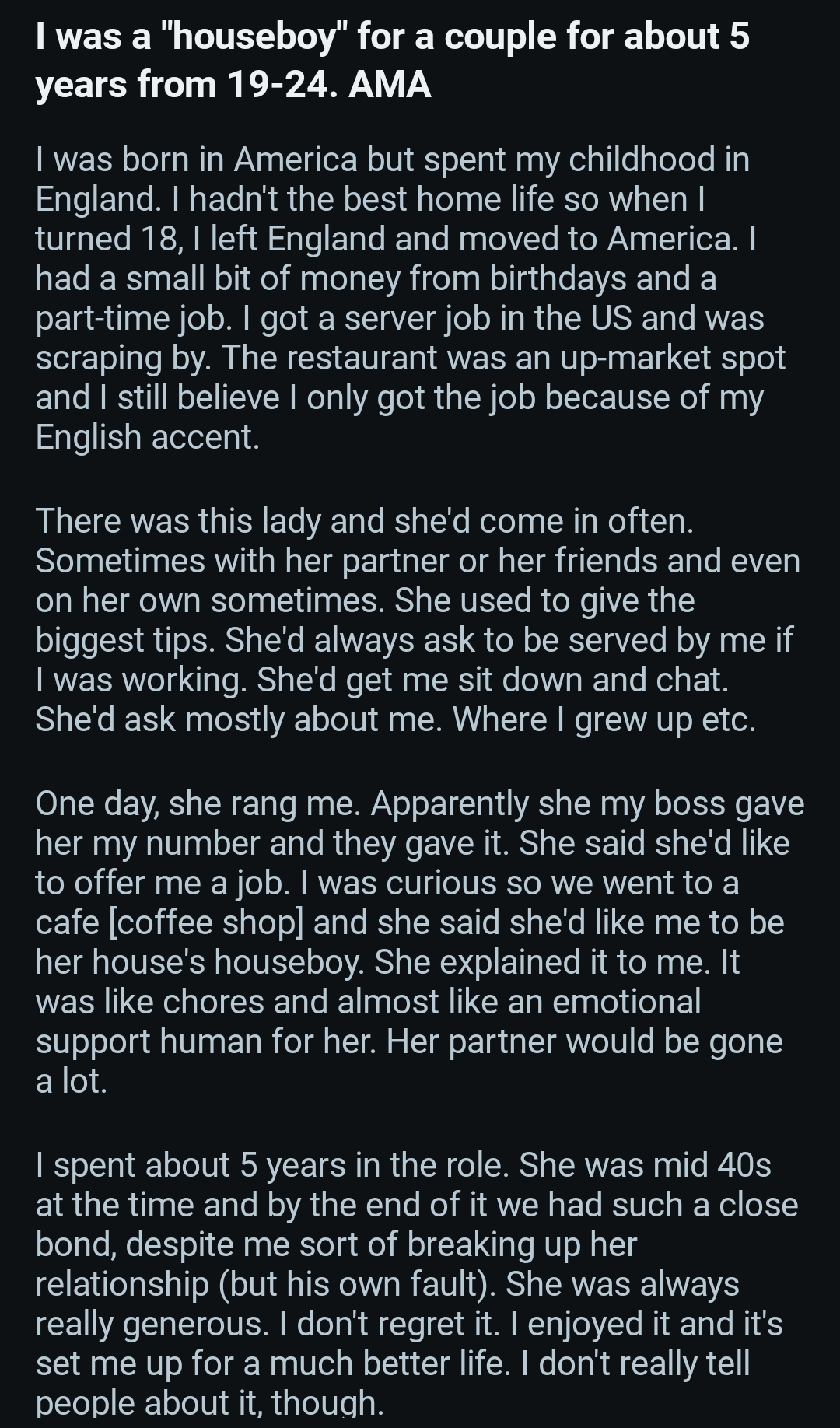 >>79930524honestly i would like to have a non sexual relation with an older lesbian - probably mommy issues speaking here but id take that servant position like the guy here >>79930455occasional non sexual cuddling maybe, tips for dating girls, easy money just working in her house, decent option desu
