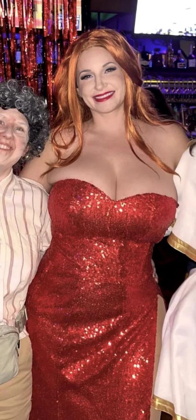 >>79951496Not even that. I have a suspicion that ever since Heidi Klum did this extremely high effort cosplay of Jessica, now every cosplayer feels the need to put in a bunch of effort so most don't even try. Forget about the insane makeup or trying to play up the proportions, all they need is a red dress, purple gloves, and a red wig.More big titty chicks should just do like picrel.