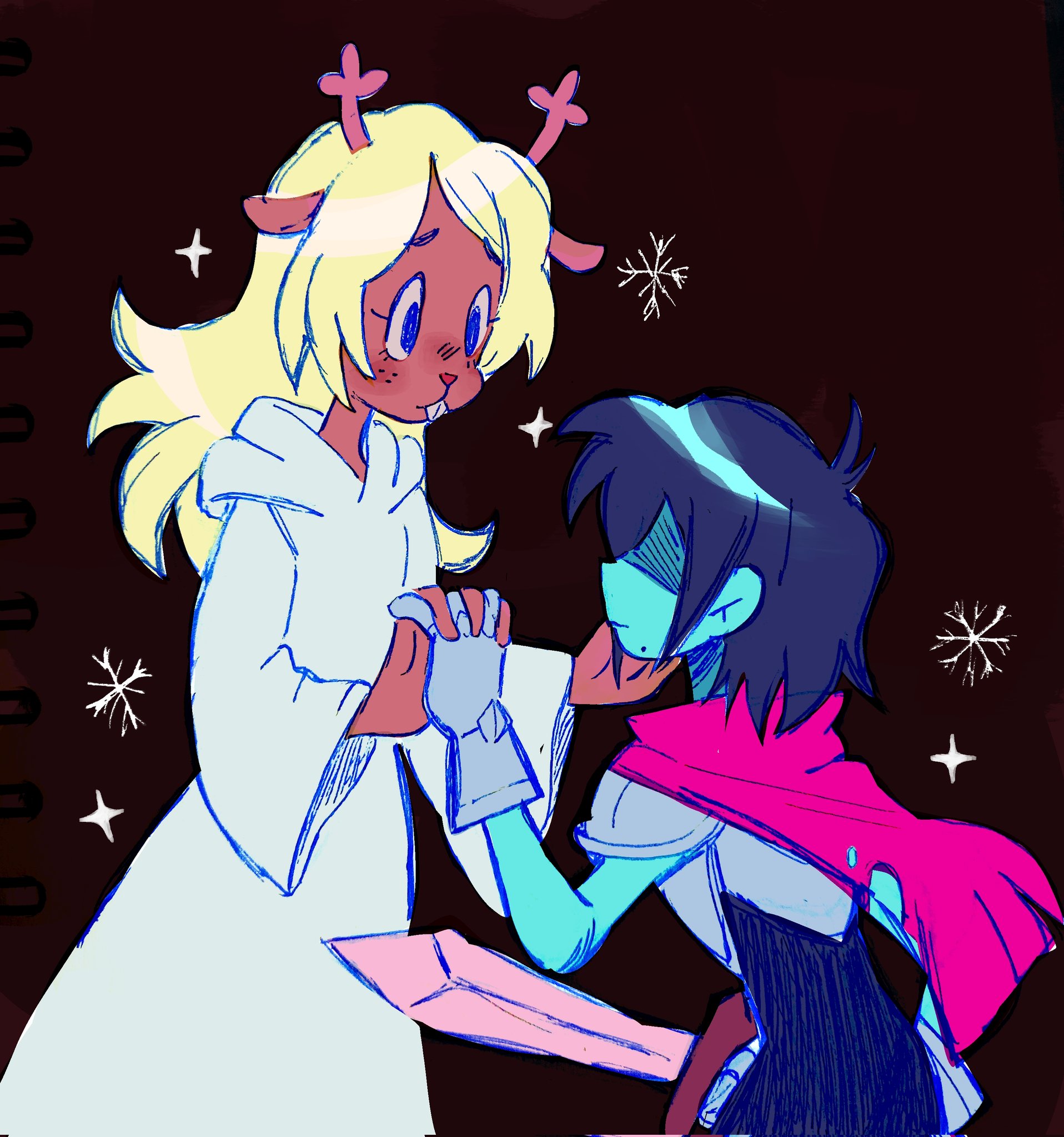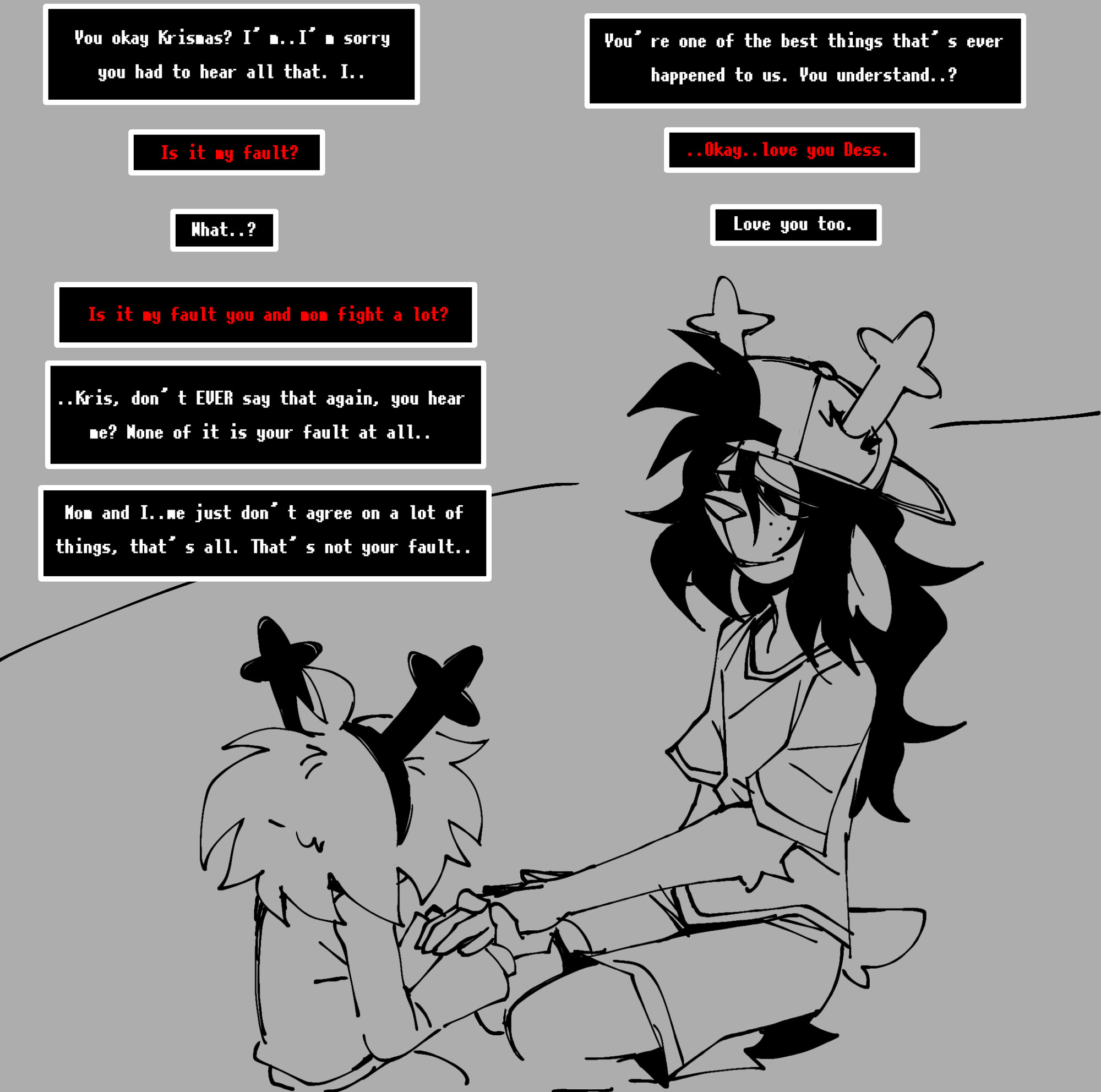 >>79952745>>79952765Honestly, I'd dig this being explored more. The thought of Kris searching for a maternal figure that "gets him" is interesting, especially if he can't be open with Toriel.Naturally, Dess is more the big sister type, but if Kris is young enough that line blurs.