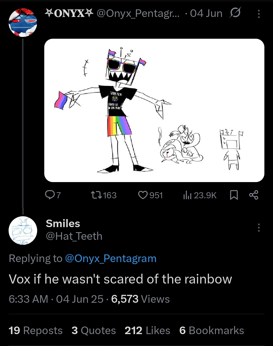 >>79971897>Vox is a homosexual leaning bisexual that hates pride flagsHe might be the most literally me character I’ve seen.