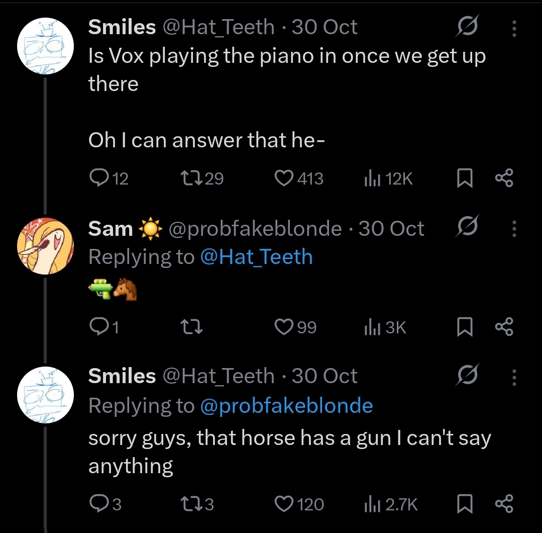 >>79972058What are your bets?1. Alastor taught Vox how to play the piano / they played together (more flashbacks of their backstory)2. Vox learned to play the piano when he was alive (flashbacks of his human life)3. Vox doesn't know how to play piano and was faking it4. 70s/80s voxval played piano together (flashbacks of their backstory)