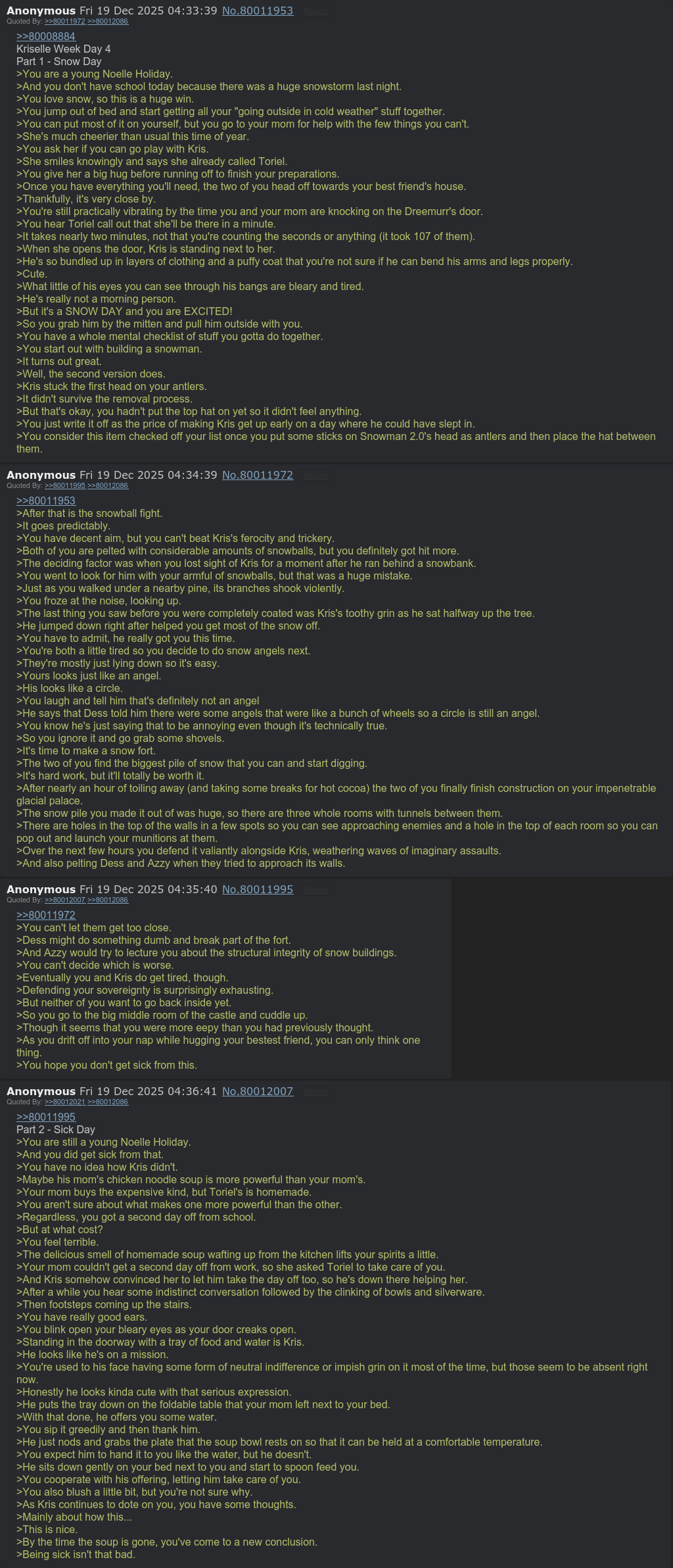The Home of Doerot & Kriselle.Krismas Elves Edition>Relive The Doerot:desuarchive.org/trash/search/subject/%2Fdoe%2F/>Temporary Gallery:mega.nz/folder/TGJRwabb#r86F4JdQw54UBpO_j2OPEA>Doe Ficsrentry.co/DoeRecs>Doegame:deltarune.com/>Childhood's End & Heartbeat At Midnight VNs:balsamianxxx.itch.io/childhoods-endbalsaminaxxx.itch.io/heartbeat-at-midnight>/doe/ AUtism Synopses & Collections (backup):archive.ph/nyMEt#selection-75.0-201.27>Last Doerot:https://desuarchive.org/trash/thread/79998479