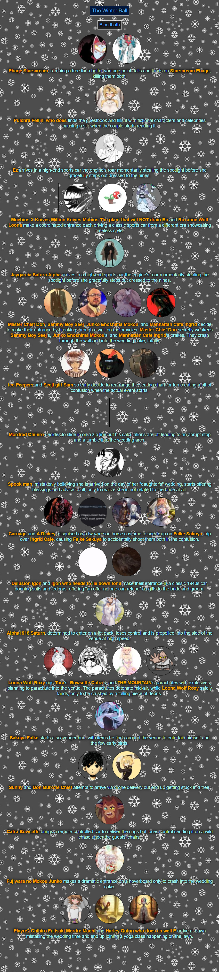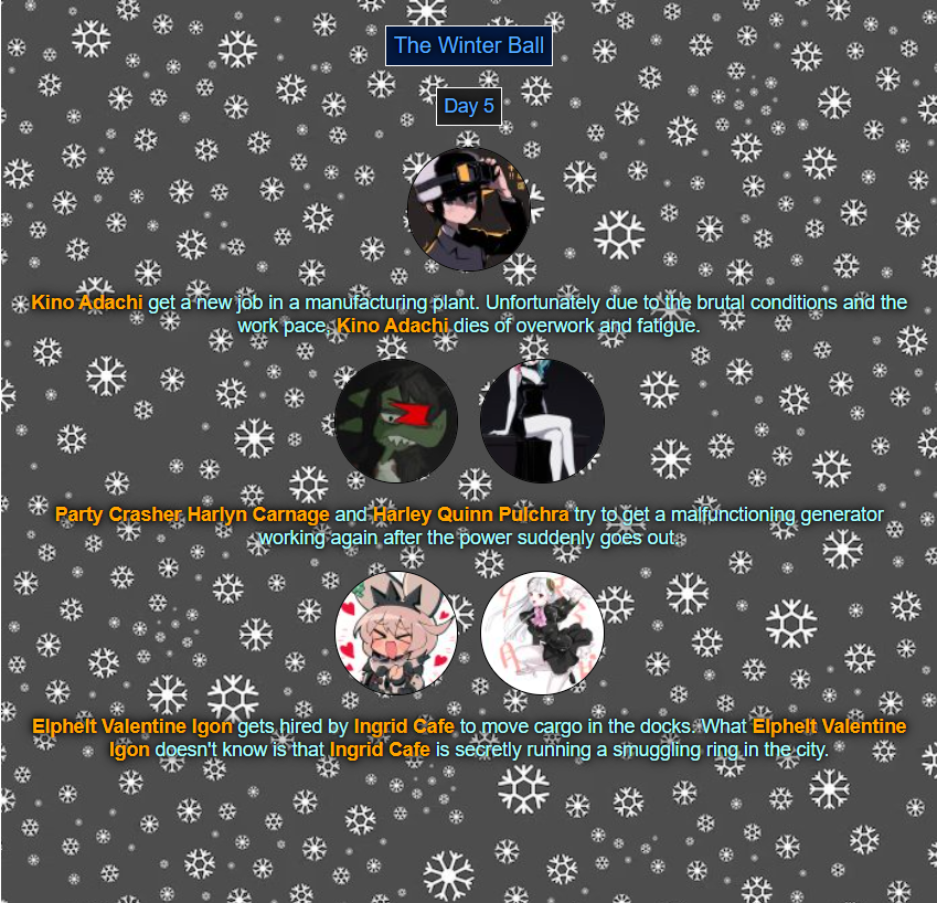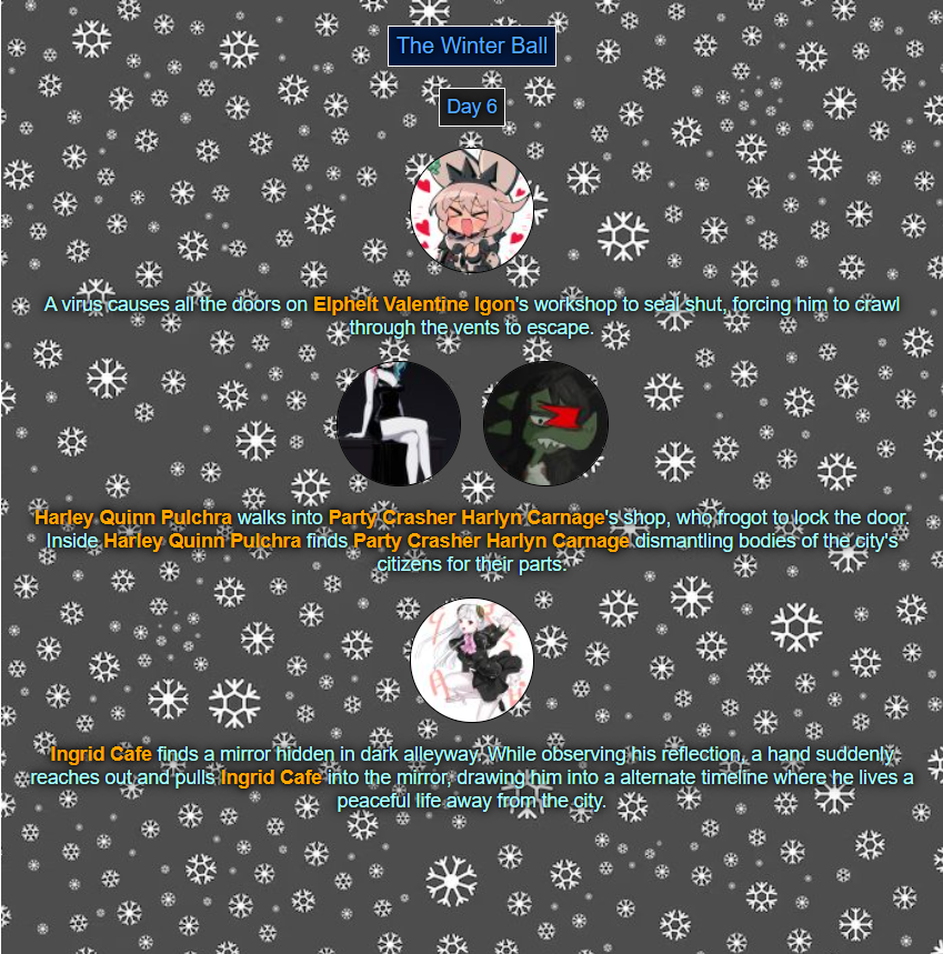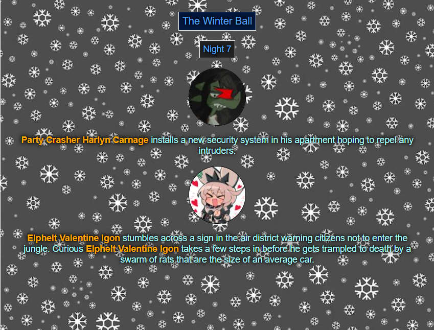 >>80054044Read'm and weep! Chaos has come to your winter ball! >>80054056You tell'm buddy.>>80054079See ya next week.