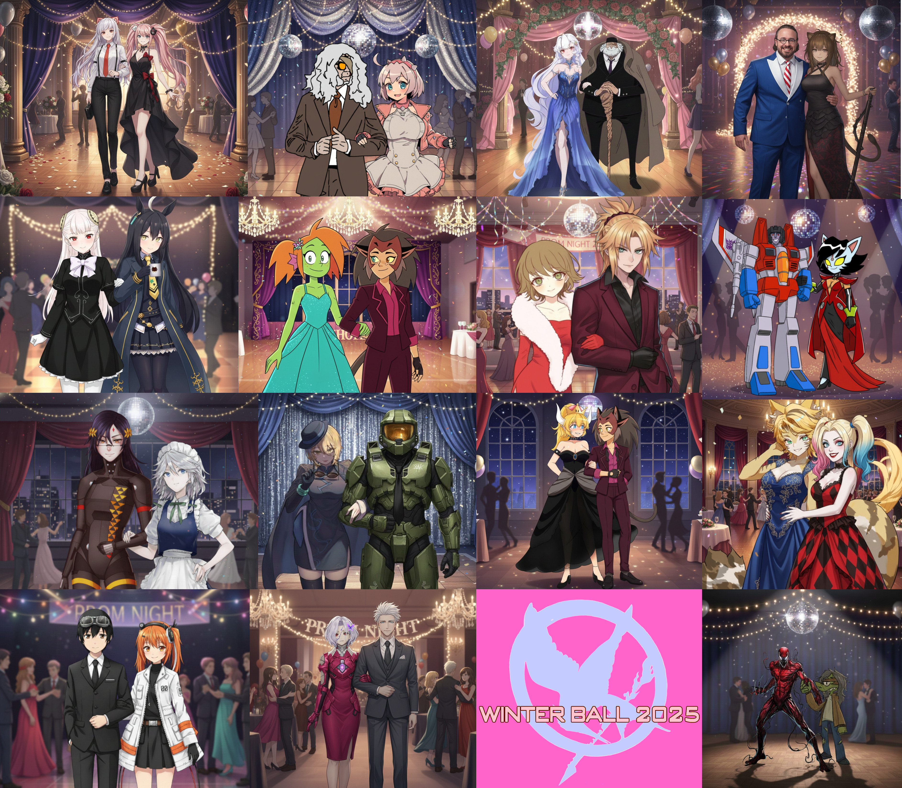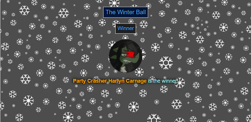 I'll wait for the full 30 minutes this time since it IS the final game of the winter ball, let the moment sink in and such. Before that, I would like to extend special thanks.Special thanks: Simdev for improving his simulator midway in so the next time I do prom, it'll be much easier for me, Harley for making those pictures of the couples, Mado for making the collage that will come soon, Catra for being my date, and most of all... This is cheesy but- YOU! This event wouldn't have been such a success without your attendance, I'm directing this towards the person reading this. Thank you all for making this so enjoyable.