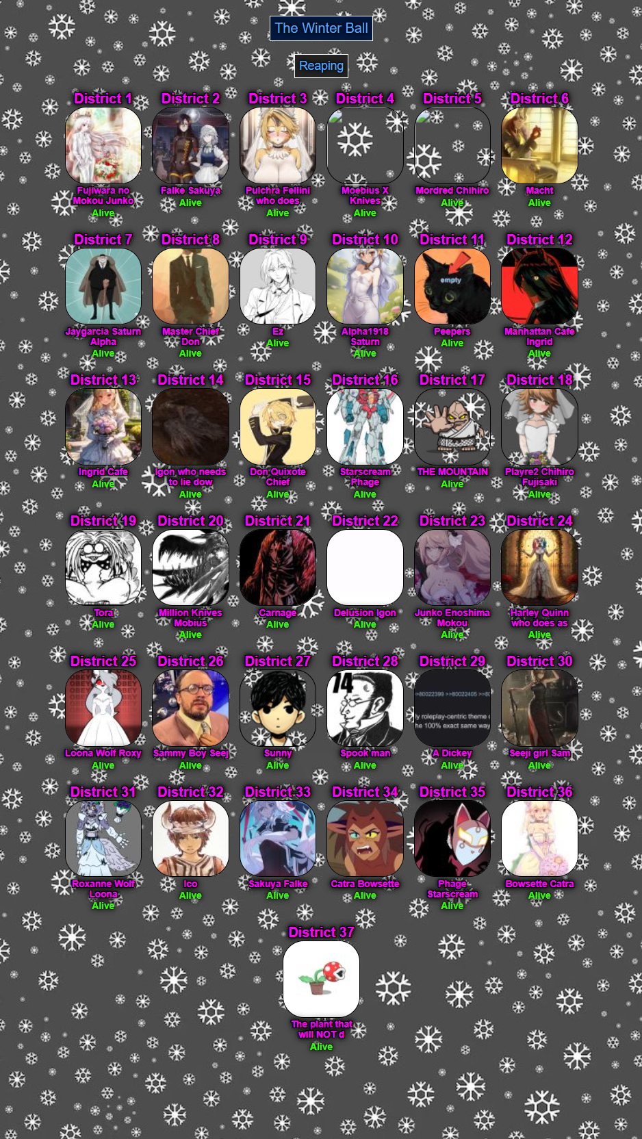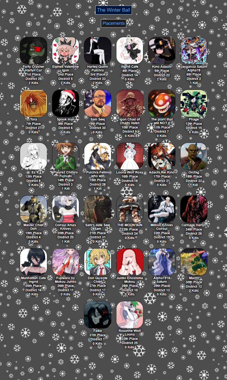 PLACEMENTSIt is not a sin to fight... For what Is right... Give in to your anger, let it flow through you.THANK YOU ALL FOR ATTENDING THE THIRD GAME OF THE FINAL NIGHT OF THE WINTER BALL! IF ANY HOST IN THE LINEUP WISHES TO HOST, I WILL WAIT 20 MINUTES! IF NOT, I SHALL HOST AGAIN!