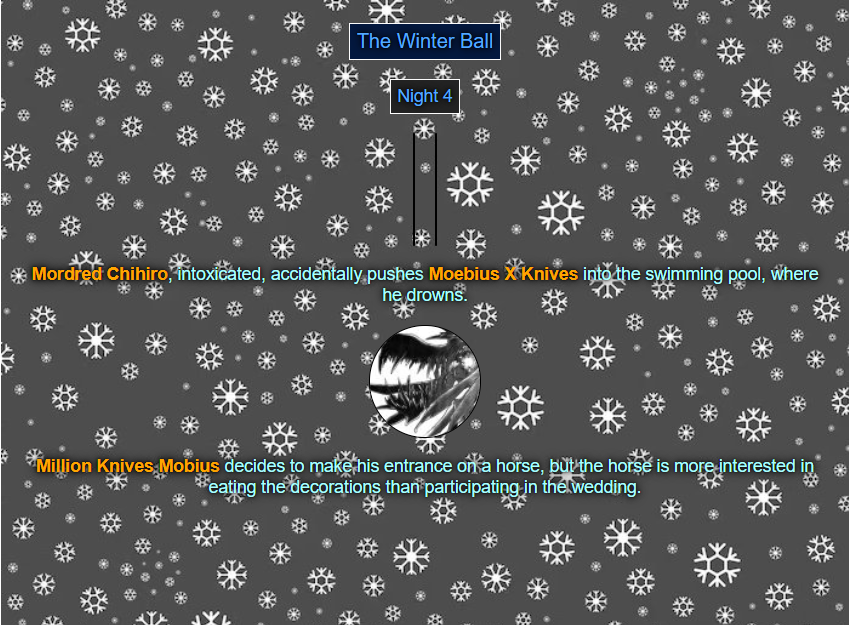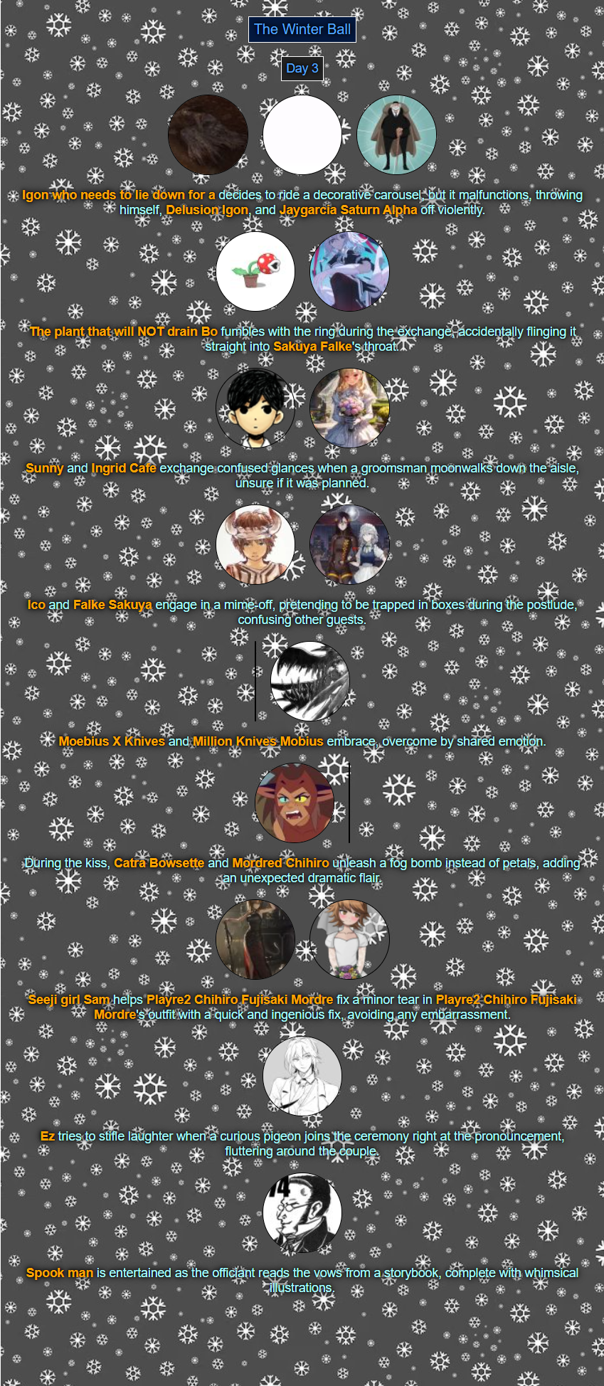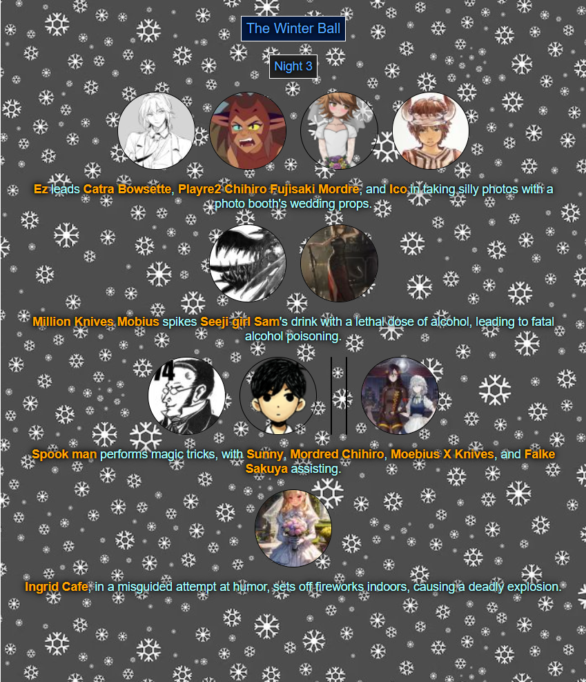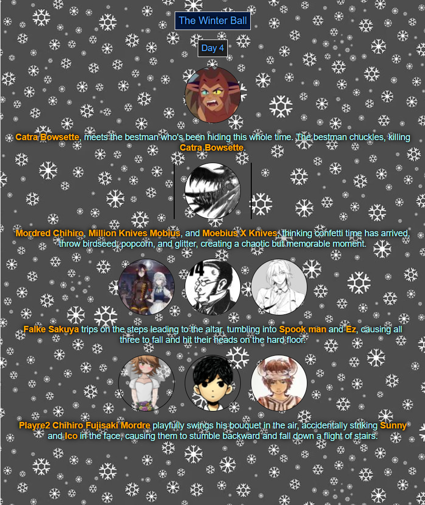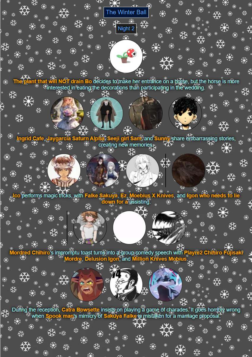 >>80054044Read'm and weep! Chaos has come to your winter ball! >>80054056You tell'm buddy.>>80054079See ya next week.