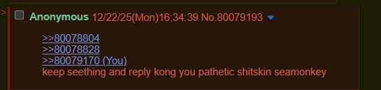 >>80078804>>80078828>>80079170keep seething and reply kong you pathetic shitskin seamonkey