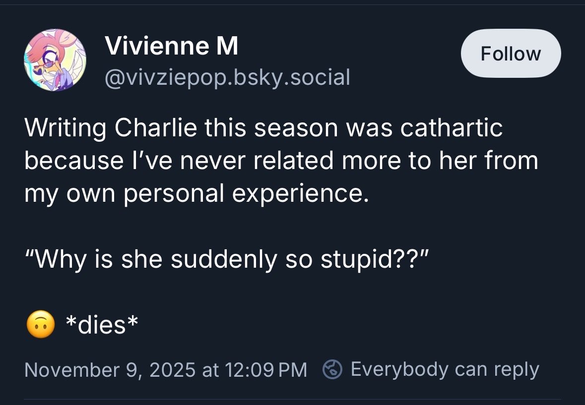 Radiosilence is so much more interesting to me than radiostatic. I wish I could get more into radiostatic but my autism brain can’t stand AUs or anything that feels “out of character”, which is pretty much all of it. Meanwhile radiosilence is basically canon at this point which means my brain allows itself to indulge it