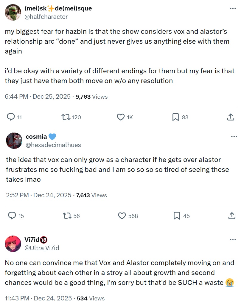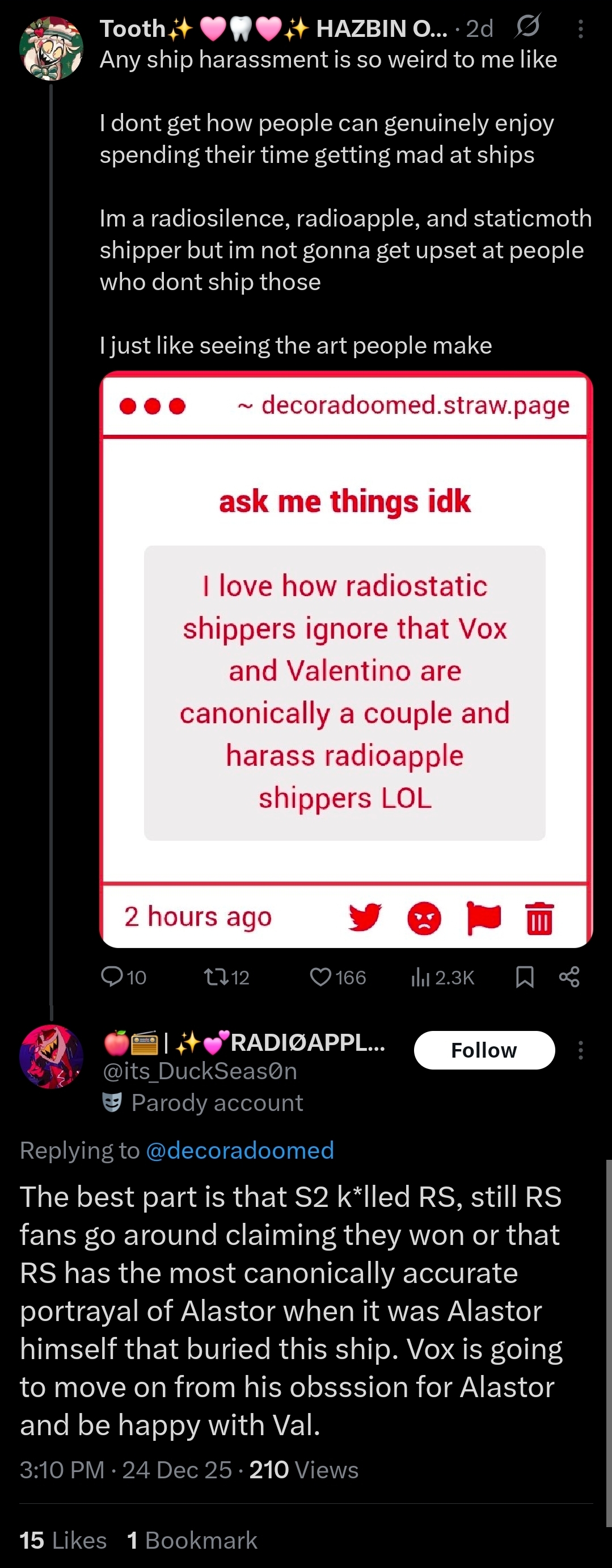 Tbh all twitter shippers, excluding the super clinically insane ones who are too delusional to be saved, are hugely insecure rn.Radioapples are desperately holding onto the hope that their executioner Alastor theory will come true and are praying for Lilith to be a massive bitch to Lucifer, hoping that she'll break his heart and kickstart their divorce arc.While Radiostatics don't want Vox to move on from Alastor completely, but in the case he does, they want them to be friends again ala Fizzblitz.And Staticmoths are praying to every god for Vox to come to his senses and realize he loves the Vees and Valentino.