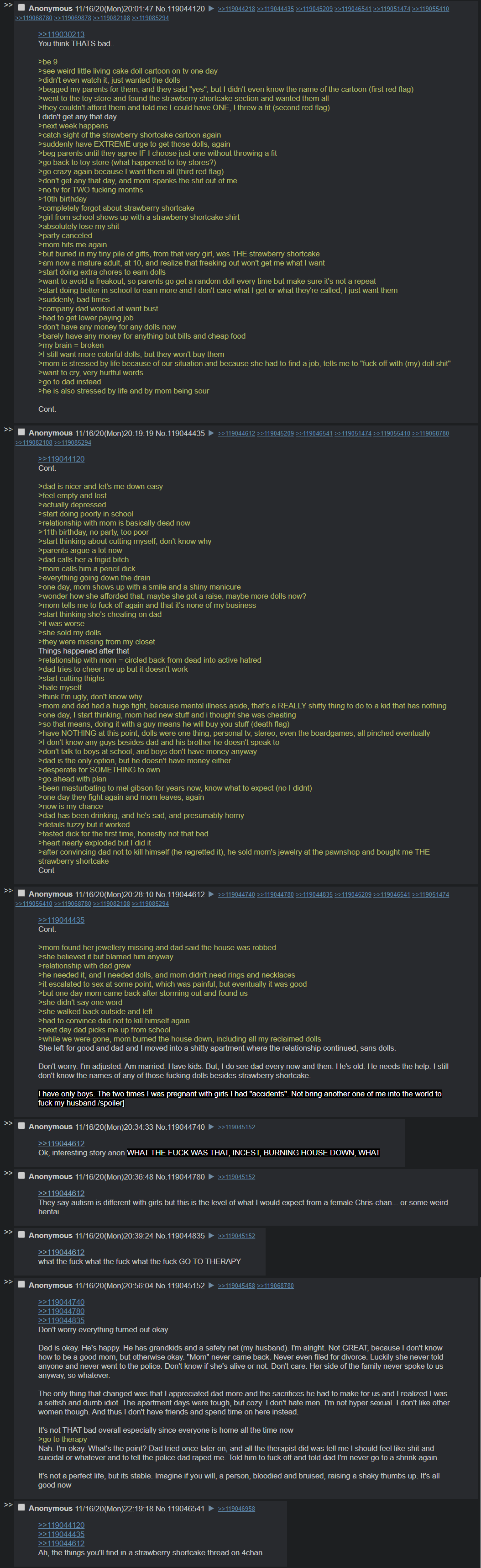 >>80177084This is why critiques about Angel having no personality don’t make sense to me. If someone has been told for decades on end that they’re only good for getting ass raped and that their fate is to be trafficked for the rest of eternity, wtf is going to be left for that person? What personality can you even retain after being abused constantly for so long? You’re just going to end up constructing your personality around whatever gets you abused less severely. What’s the point of having dreams and likes and dislikes if you’ll never be able to pursue any of them