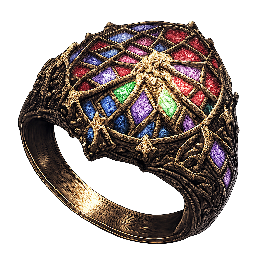 >Invoker's Signet.>A band fashioned from many smaller stones to craft a mosaic-like jewel. Although seeming haphazard on first glance, a learned eye can see the intricacy below the surface>Increases Intelligence and Attunement by 5.>Stepping back to see the bigger picture is a skill fast vanishing from the world. One should take care to hone this skill, lest they fixate until all that is unseen ceases to be.