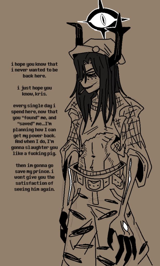 >>80204359>Susie = Dess>Chapter 1 is a parallel for the very end of her life>She and Kris explore a Dark World together like they have before>but to inverse Susie becoming good, Dess becomes corrupt for whatever reason>ends with the Dessappearance>Kris is left alone and estranged from Noellekinda meh but you'd need a lot of work with the other chapters to make this feasible