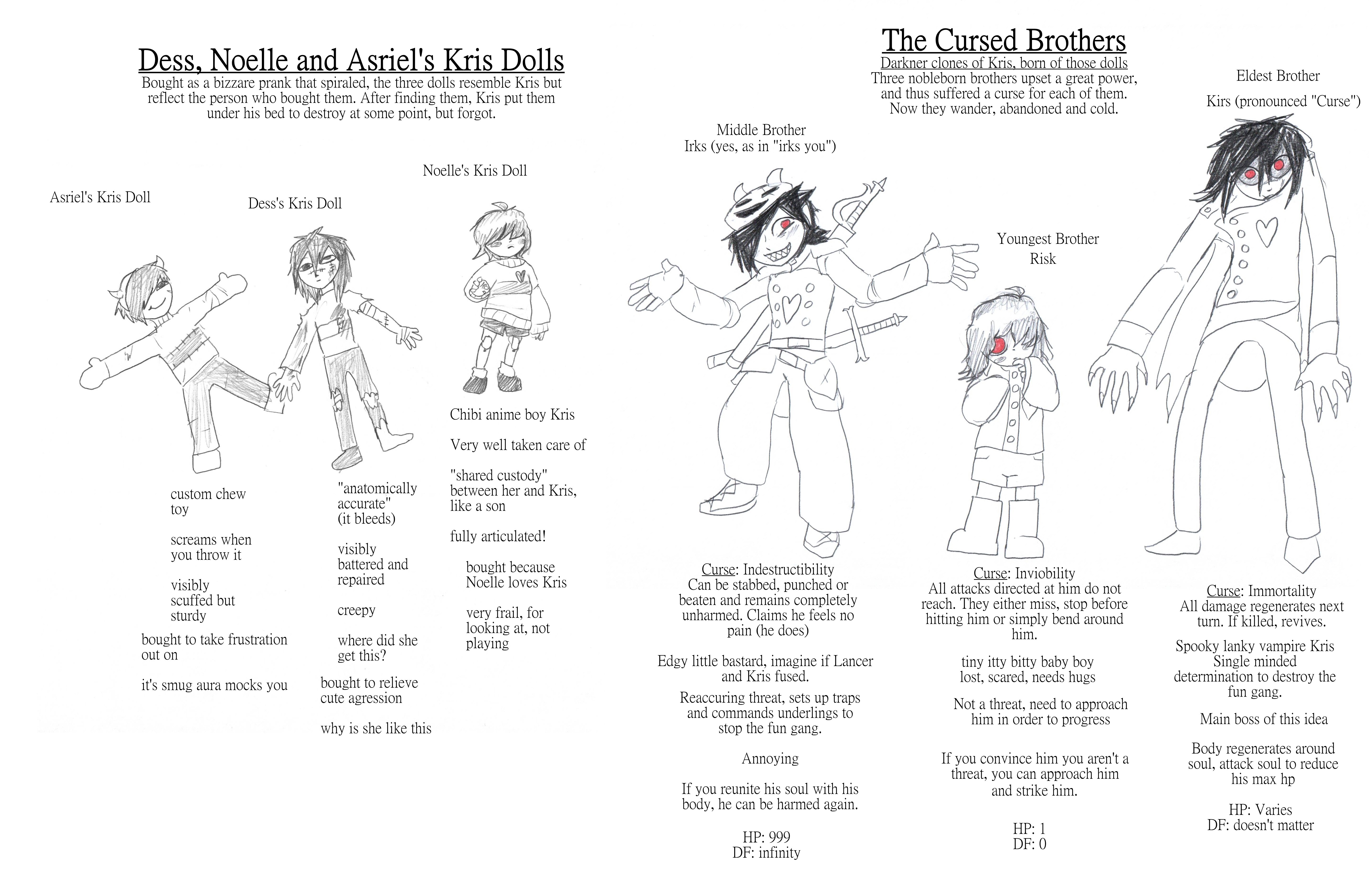 >>80206579wrong, that's the noelle one. they aren't in the same order on the right side.it goes Asriel, Noelle, Dess. it's pretty obvious if you compare their doll descriptions.Irks is the annoying sibling stand in (Asriel's stress toy, described as sturdy thus has insane defense)Risk is the precious frail one (Noelle's chibi doll, called "very frail" and thus not to be played with, making it untouchable)Kirs is the punching bag (Dess's "battered and repaired" cuteness aggression outlet, has no defense but extreme regeneration because it's not fun if he can't feel it / if the doll isn't visibly damaged)