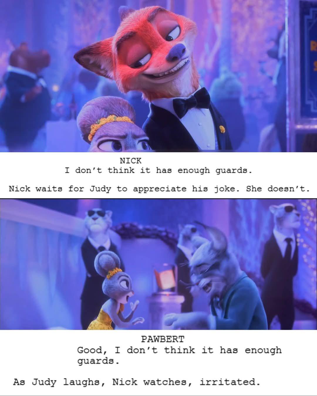 >>80229211I think a point to note why the foxy dad thing could be important, is it was Nick's idea. At this point he may have been falling for Judy and even if subconsciously has her as his one and only. So it manifested in the married couple get up. They use actual animal traits to distinguish each species and foxes are very monogamous. I'm not saying this is for sure exactly what they were doing, but it's a possibility. If they had vague story bots for 3 mapped out during 2 and were like “ok change the opening under cover thing to foxy dad, cause we know Nick has already fallen for her somewhat by now and foxes are super clingy to their mates“ >>80229441I feel like Jared and Byron 100% know how their relationship is going to end up in 3. So they're obviously not going to say one way or the other. So the wording out of the picture yet doesn't bother me like it initially did. At first it makes it seem unlikely but we may think about it. Unless that's just how you worded it lol. Honestly they know what they're doing and I think I know what they're doing and I hope I'm right. If I am it will be my favorite trilogy, and romance, from Disney. Period. Not just cause its furry though that is a plus, but because it's so well done. Actually I think being furry helps all the prejudice and hate messages hit much harder.