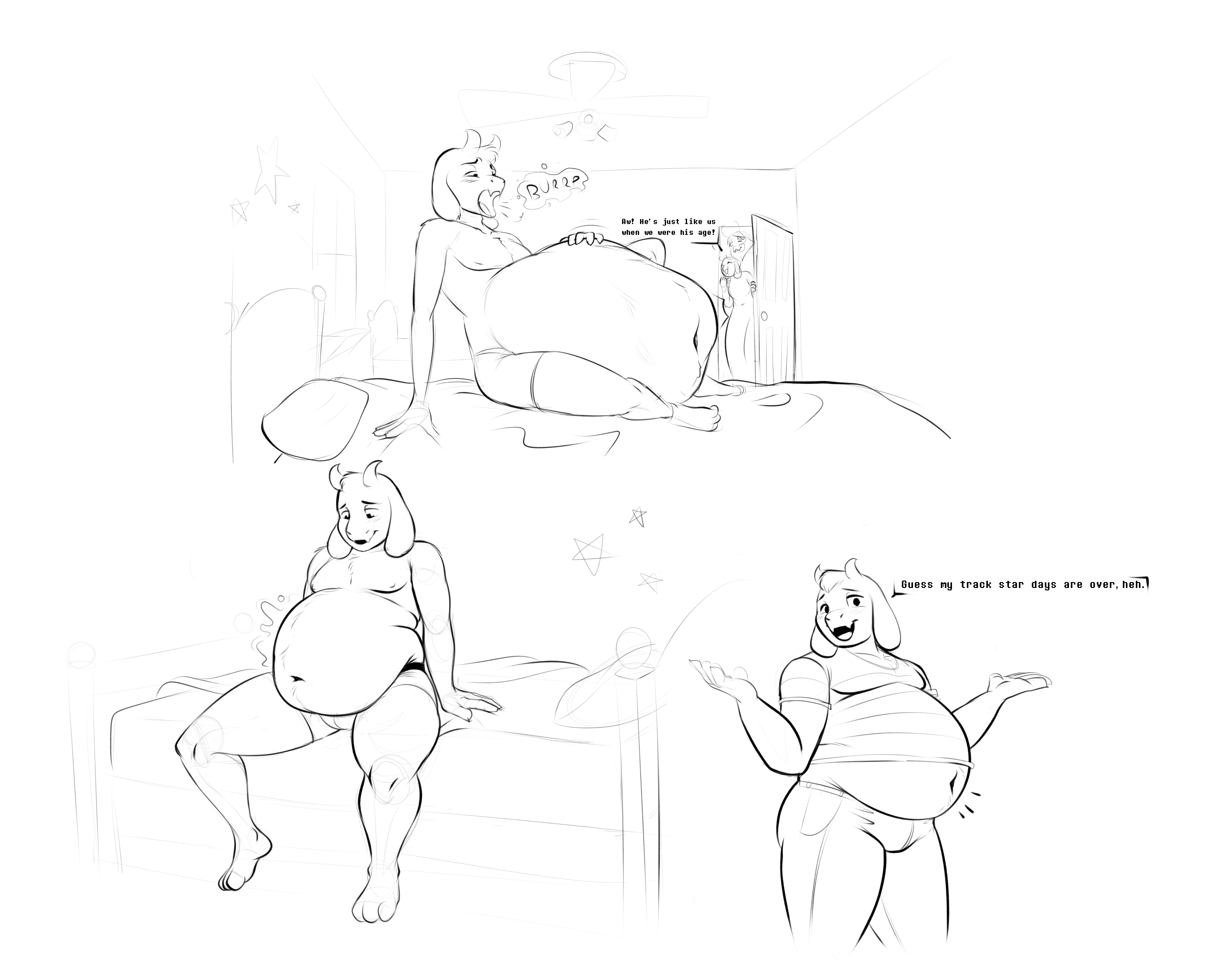 >>80230811>Being his girlfriend, the soft (both literally and figuratively) hearted boss monster forgave her after the session, especially when he was the one who reaped the benefit of being able to play with her new curves afterwards.>As a boss monster, he was quite a fair bit more dense in his make-up compared to other monsters, not to mention that Dess was still slightly shorter and smaller than him despite her physical activity, which meant he was worth quite a lot in the calorie department.>It was no wonder why the reindeer's figure had completely fallen apart post-Asriel.>First were her breasts, which were already at a fairly respectable size of a pair of hand-filling tits.>Now, the two soccer-ball sized mounds strained her sweaters to the point of an obvious cleavage with an added valley between them from how far they stretched out.>Next was her stomach, which was completely flat and even showed the makings of a six-pack once upon a time.>Churning Asriel certainly dashed any hopes of that ever coming true however, a gut now hanging at least a foot in front of her, additionally ruining any chances of closing a jacket until she could lose that weight.>It's become a bit of a joke within their group to call it Asriel's timeout corner, with Dess teasing the flustered goat about it whenever she had the chance, especially if had decided to let out a particularly loud groan.>Finally, the last bit that Asriel had contributed lied right under her gut, being her ass and thighs.>Her history as an athlete meant that even before, she had quite the toned ass that turned heads whenever she decided to wear any kind of revealing clothing.>But after churning an entire boss monster, the reindeer found herself cursed with the inability to fit into all but the baggiest of jeans, which still struggled to contain the veritable globes of ass fat she now carried around.