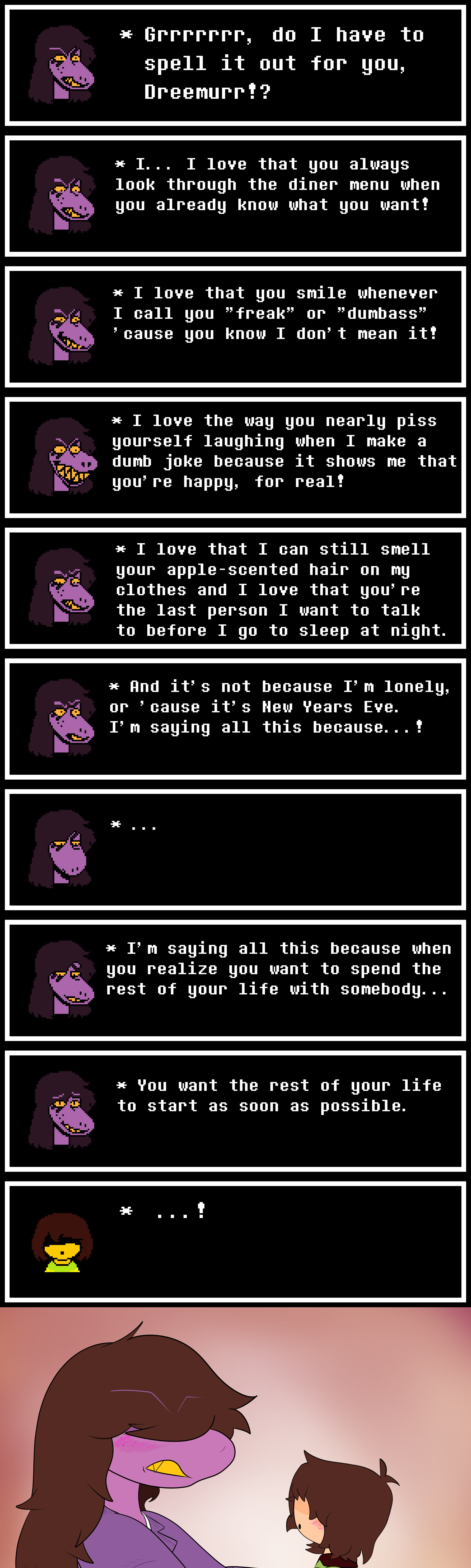 >>80297781Certainly, Kris and Susie aren't without their own foibles. Susie still has some unresolved bullying issues to fully resolve with Kris and Kris is, well, all kinds of fucked up too. These things can't be ignored if they're to ever be in a relationship but despite their issues it's apparent that their feelings for each other are sincere.Noelle specifically has certain oddities when it comes to pursuing a relationship with Susie that makes even a fledgling relationship sort of shaky. I don't need to reiterate—it's beating a dead horse—but it can be hard to tell where the "real" Noelle begins and ends when she's around Susie. Many moments in the mansion emblemize this for me IMO. Noelle has so many backed-up feelings for Kris during that segment, especially their intimate association with the Ferris wheel, that she can't even give Susie a straight answer on what riding one with Kris *means* to her.It just paints a picture that Noelle needs to work through some things before diving into a relationship. Shipping bias aside, I don't think it's too ludicrous to believe that future chapters will involve relationship drama so I guess we should stay peeled.