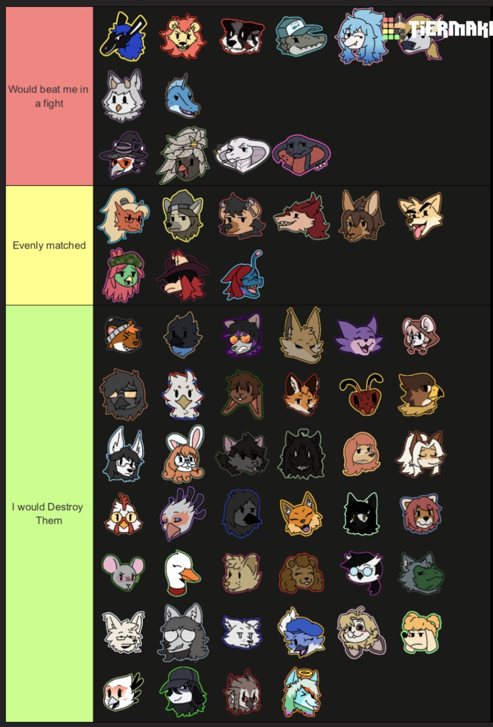 I was mainly going off of vibes, species, and the few I already knew stuff about when I made this. Probably not 100% accurate. 1v1 fair fight. Fists or claws, and natural abilities no weapons.