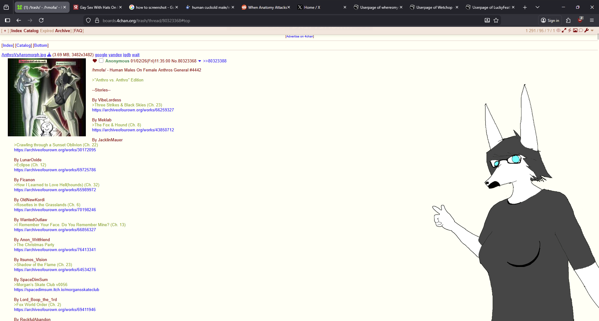 /hmofa/ - Human Males On Female Anthros General #4442>"Anthro vs. Anthro" Edition--Stories--By VibeLordess>Three Strikes & Black Skies (Ch. 23)https://archiveofourown.org/works/66259327By Meklab>The Fox & Hound (Ch. 8)https://archiveofourown.org/works/43850712By JacklinMauer>Crawling through a Sunset Oblivion (Ch. 22)https://archiveofourown.org/works/30172095By LunarOxide>Eclipse (Ch. 12)https://archiveofourown.org/works/69725786By Ficanon>How I Learned to Love Hell(hounds) (Ch. 32)https://archiveofourown.org/works/65989972By OldNewKordi>Rosettes in the Grasslands (Ch. 6)https://archiveofourown.org/works/70198246By WantedOutlaw>I Remember Your Face. Do You Remember Mine? (Ch. 13)https://archiveofourown.org/works/66856327By Anon_Writfriend>The Christmas Partyhttps://archiveofourown.org/works/76413341By Itsunos_Vision>Shadow of the Flame (Ch. 23)https://archiveofourown.org/works/64534276By SpaceDimSum>Morgan's Skate Club v0056https://spacedimsum.itch.io/morgansskateclubBy Lord_Boop_the_1rd>Fox World Order (Ch. 2)https://archiveofourown.org/works/69411946By ReckfulAbandon>Songbird (Ch. 11)https://archiveofourown.org/works/56948341By JP5>Merry Christmas, Morgan: Rewrappedhttps://archiveofourown.org/works/76267986By MrFanMan42>Survivors of a Shattered World (Ch. 28)https://archiveofourown.org/works/39609141[ Story Masterbin ]: https://rentry.org/hmofa | [ Story Update List ]: https://rentry.org/hmofa_updates[ Aggie ]: https://magma.com/d/jr4tQwNwEc | [ Thread Filters ]: https://rentry.org/fsdnd[ Writing Guides, Media, Misc. ]: https://rentry.org/hmofa4Previous Thread: https://desuarchive.org/trash/thread/80316555Missed a thread or two?: https://desuarchive.org/trash/search/text/hmofa/type/op/