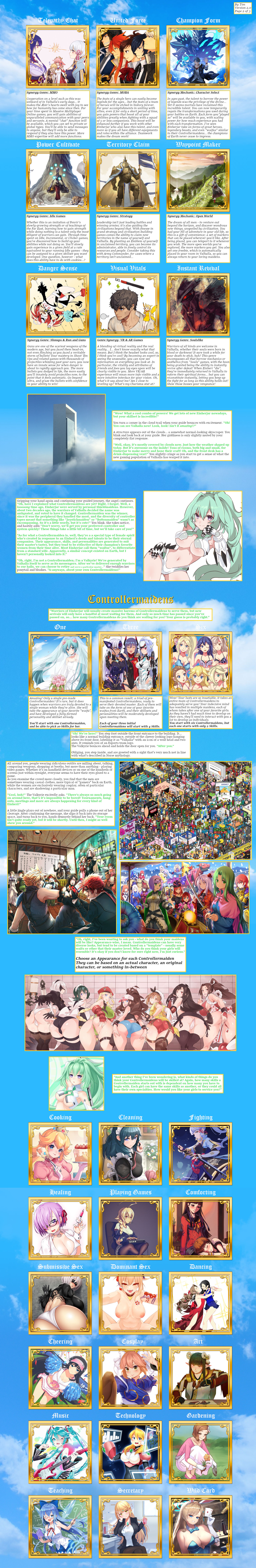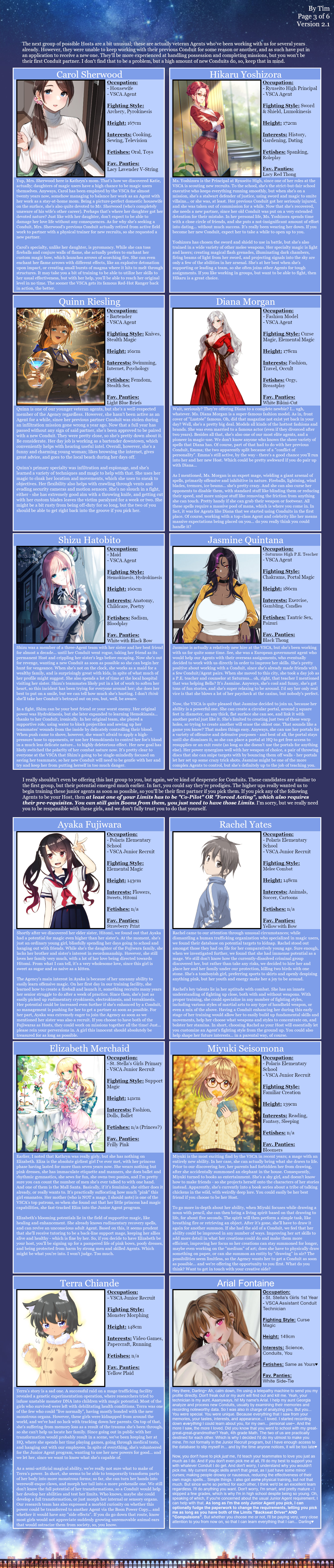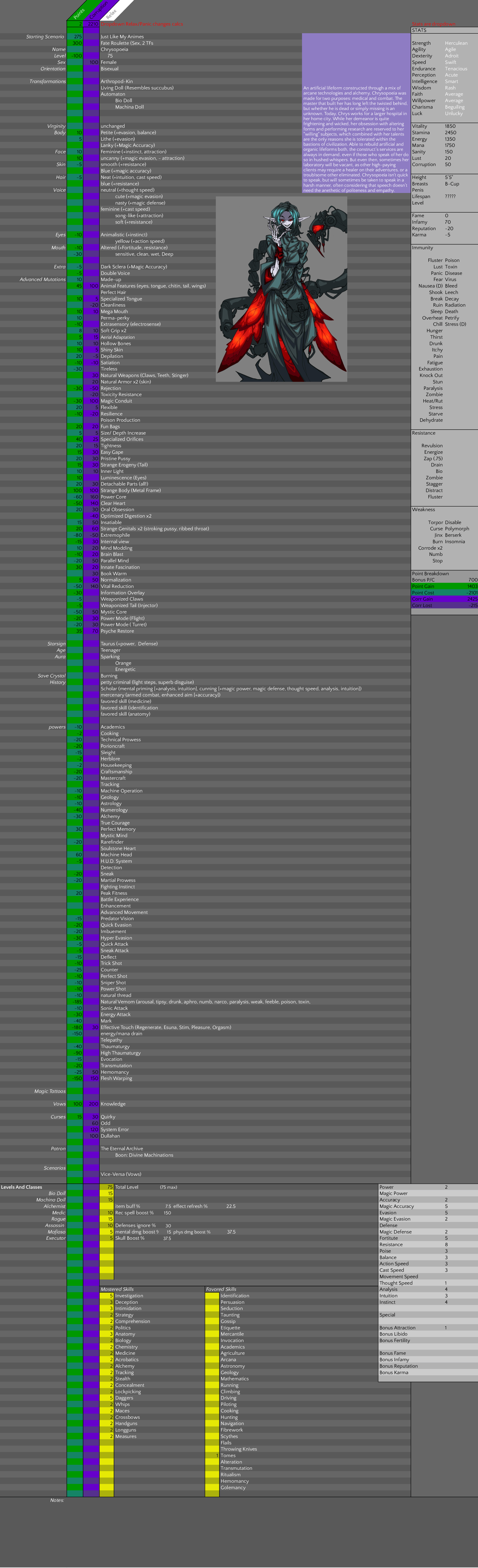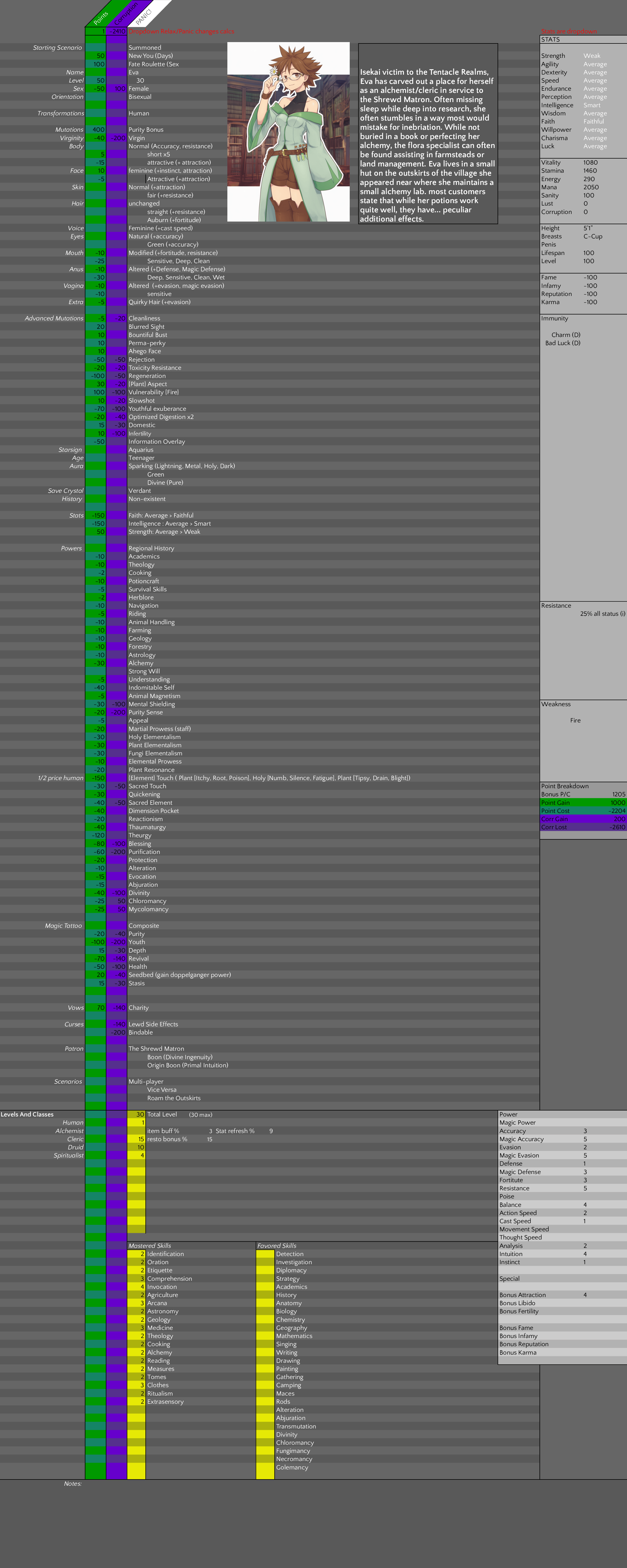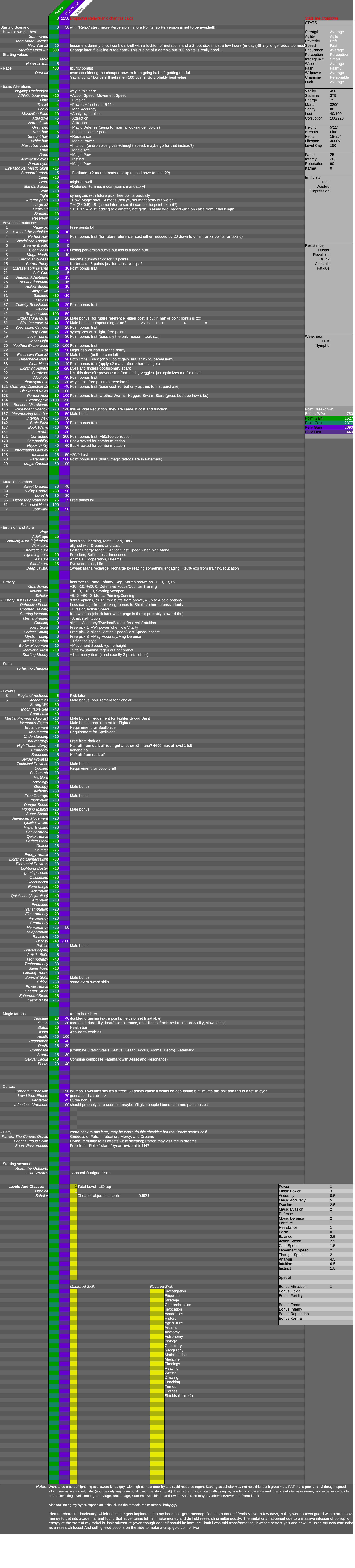 >>80394632my first build, probably very rough around the edges since I kind of just took whatever i thought was cool/I could live with. Wanted to make a magic-focused spellsword guy but got carried away and ended up with >2000 perversion lolI chose a lot of things based on things I felt seemed appropriate for me personally (like my aura color; pink isn't my fave, but I feel like dreams and lust fit me), and I based the starting measurements off of my own but adjusted from human to dark elf (so minus one inch in height, add one inch elsewhere....). Forgot to mention in the sheet that I'd be in a multiplayer scenario, and since I was summoned I'll be bringing my phone and some miscellaneous items (with tech magic I should be able to convert it to something usable in the TR, once i've settled in my outskirts village research hut or whatever)