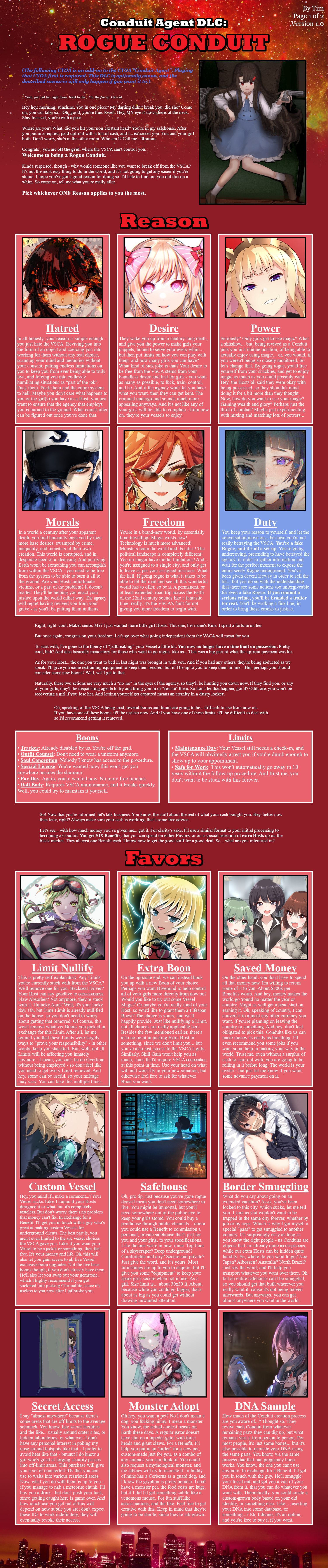 CYOA Refuge Thread - A thread for posting any and all CYOAs unpostable in /tg/'s /cyoag/ (and occasionally ones that aren't).Previous thread:>https://desuarchive.org/trash/thread/80338302Alternative link:>https://archived.moe/trash/80338302Worksafe threads:>>>/tg/cyoa/cyoag/'s CYOA archives and related resources:>https://rentry.co/cyoagIncludes - but is not limited to - a F.A.Q. section and the personal archives of a number of authors.>https://cyoa.allsync.com/s/owWor64yLTngDk3An extensive Allsync archive that has both SFW and NSFW CYOAs.>https://infaera.neocities.org/Interactives list.If you're looking for a specific CYOA, it's suggested that you check those first.And remember: Postnumbers aren't for rolling. If the CYOA calls for rolling of any sort (or you just feel like leaving something up to fate), use random.org (or https://www.wizards.com/dnd/dice/dice.htm, or physical dice, or something else that isn't your postnumber) to generate the number, and write it in the post with the rest of your build.In short: Do the rolling before you post, instead of observing the postnumber you get.