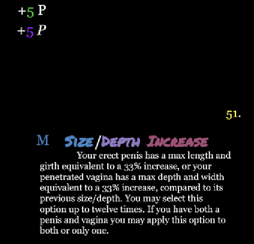 >>80418128oh and I realized something. depending on how Size Length changes penis length (if each 33% increase is additive or multiplicative from the previous), it may be optimal to start as small as possible for +12 points and then just take the increasing size mutation over and over to get bonus points and perv (which translates to more points since I'm running Relax lol) while still keeping the final length reasonable...and by reasonable I mean less than half my height
