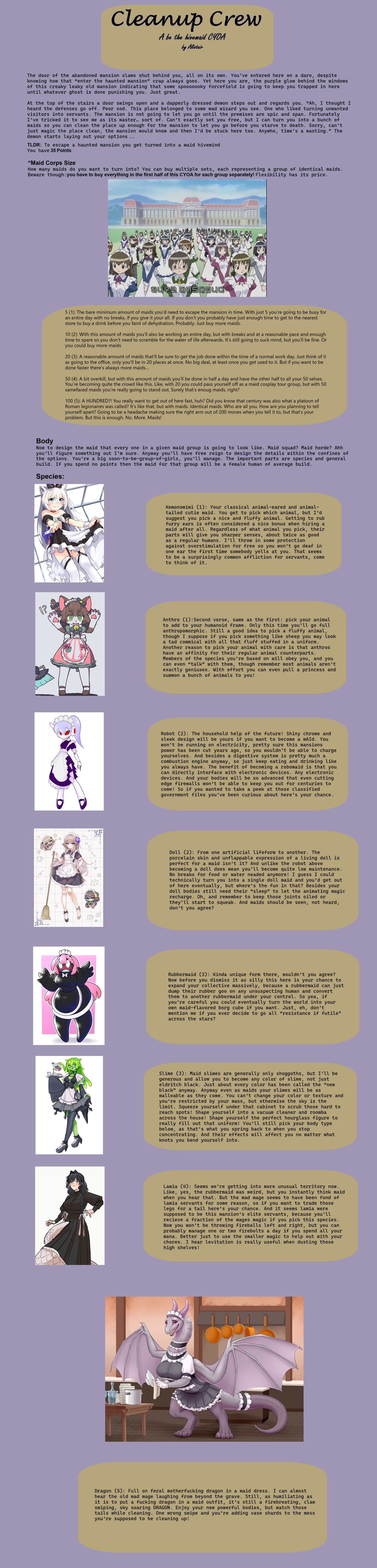 alright then, the basic imageless version of the Hivemaid CYOA has been ported over to my working environment and has has all of its costs applied and has been formatted. now just to find pictures...(you probably shouldn't expect it to be finished today, as I have an event that I'm going to tonight.)